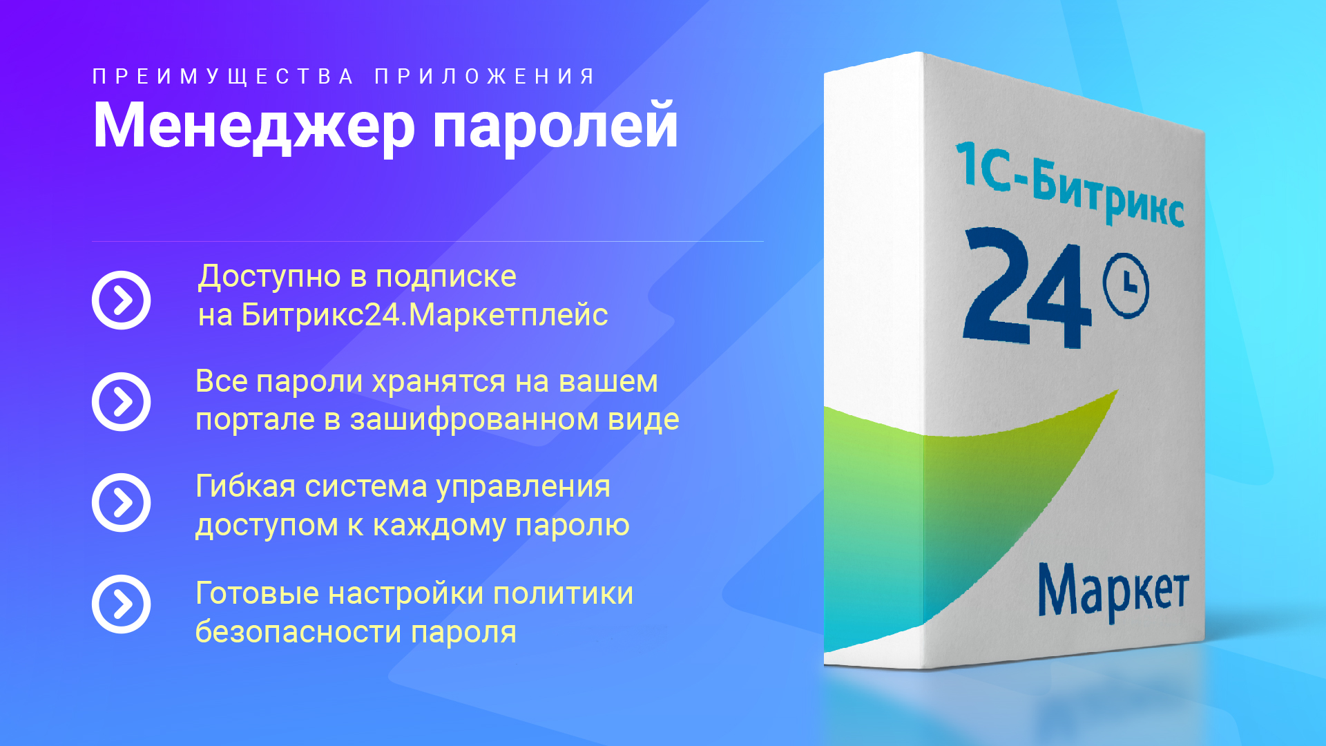 Приложение «Менеджер паролей» для Битрикс24 обеспечивает централизованное хранение корпоративных паролей с гибким контролем доступа, позволяющим назначать права для каждого сотрудника.