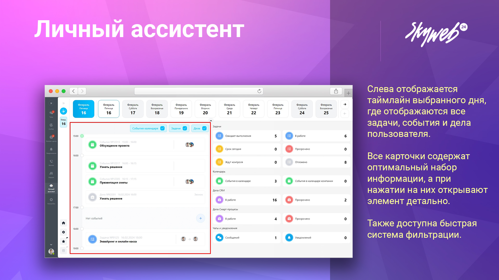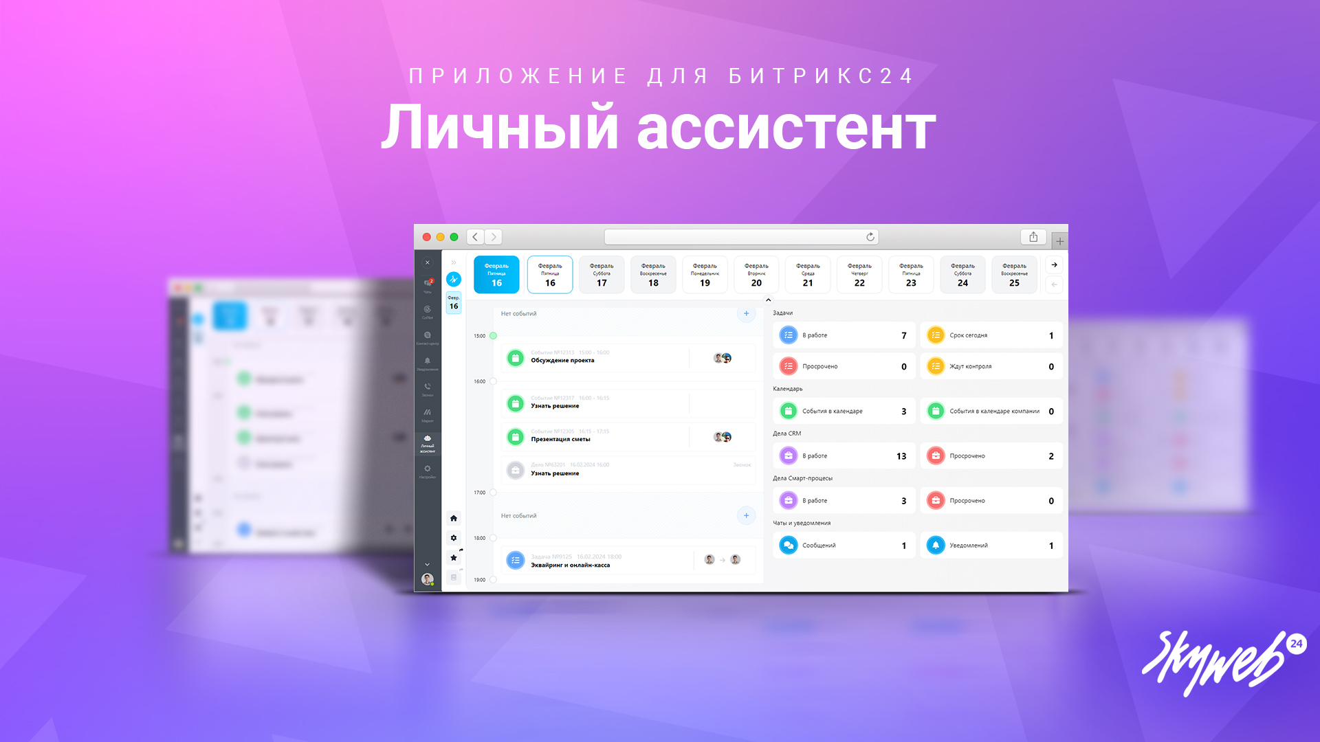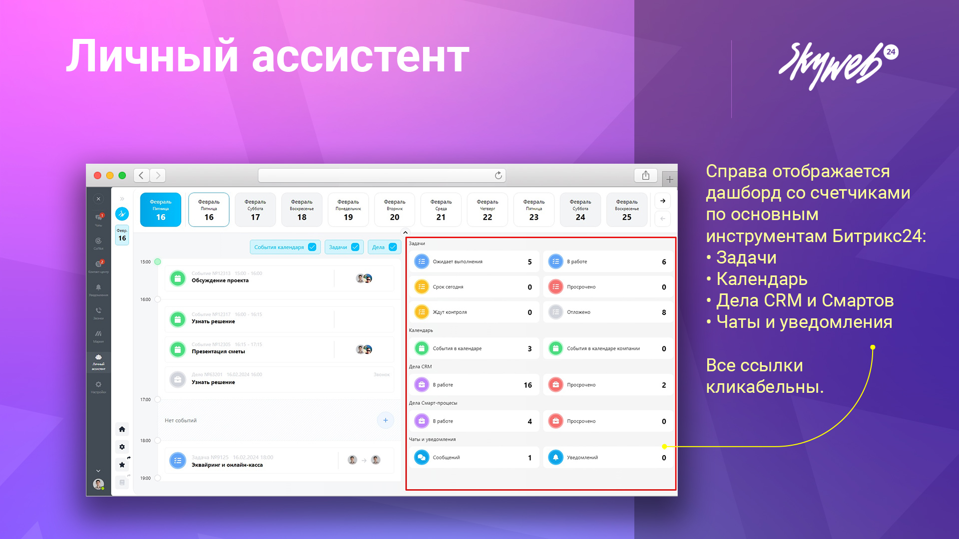 В стандартной CRM Битрикс24 нет удобного способа для автоматического сбора и отображения информации по делам, задачам и событиям. "Личный ассистент" от Скайвеб24 решает эту проблему, предоставляя инструмент, который помогает всегда оставаться в курсе всех дел и задач.