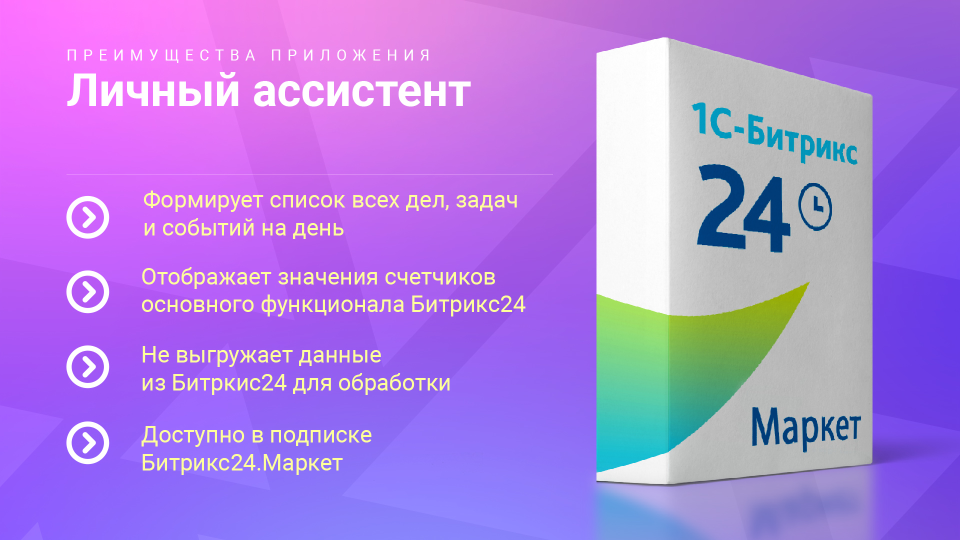 Приложение помогает вам не пропустить ни одного дела, задачи или события в Битрикс24. Умный алгоритм приложения автоматически сканирует все основные сущности вашего Битрикс24 и собирает информацию по записям, относящимся к вам, благодаря чему вы всегда будете в курсе всего важного!