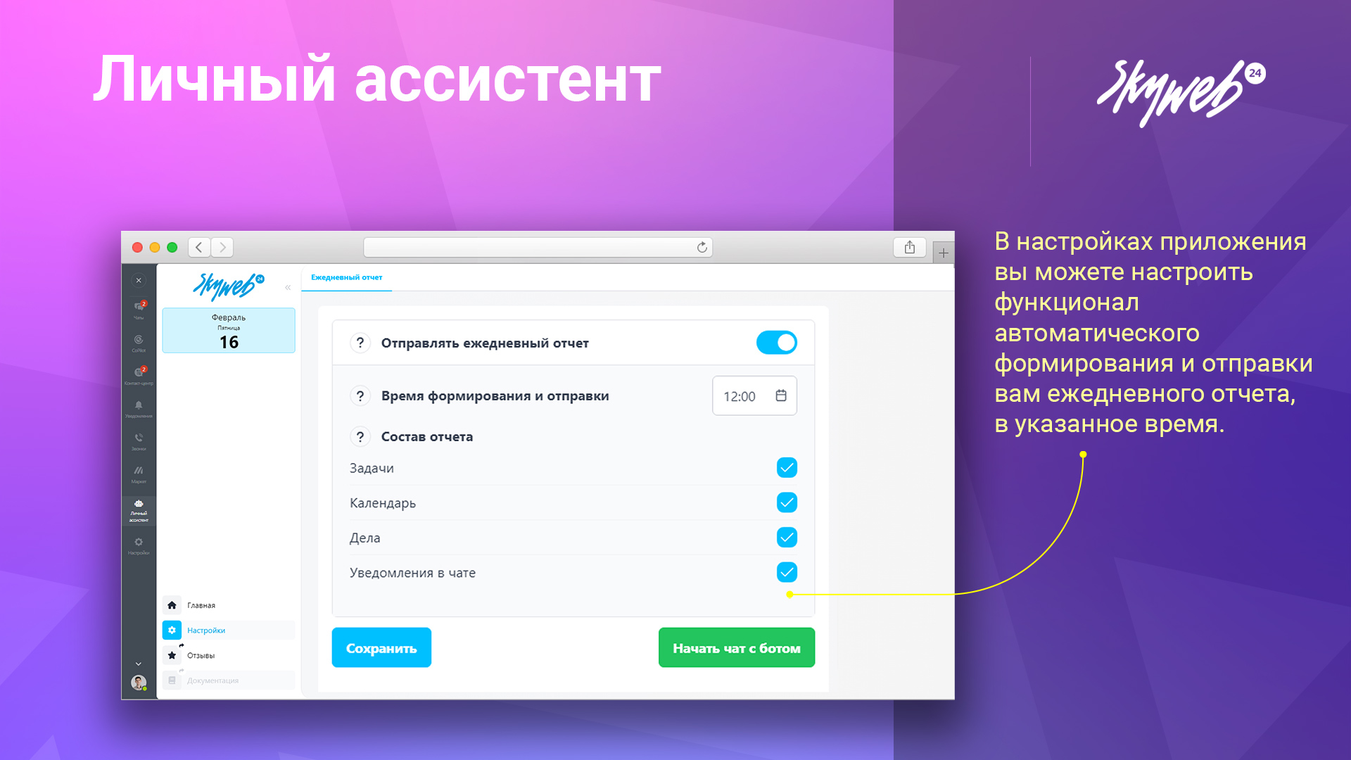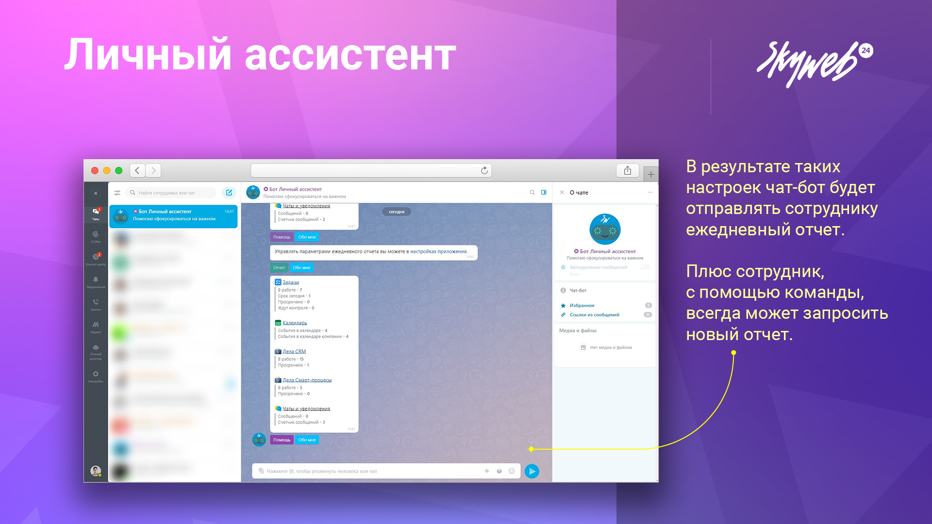 Через чат-бота «Личный ассистент» отправка информации в виде сообщения в чате, чтобы всегда быть на связи с важными обновлениями.
