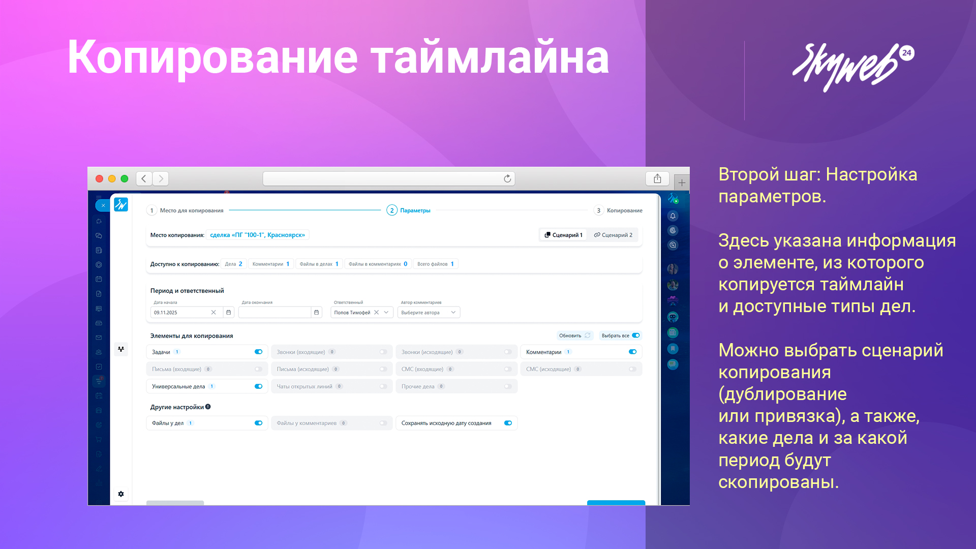«Копирование таймлайна» переносит все дела из одного CRM‑элемента в другой. Вы сами выбираете, какие дела копировать, и как именно: создать дубликаты или связать элементы так, чтобы изменения отражались сразу в обоих. Поддерживаются все стандартные сущности и вложения.