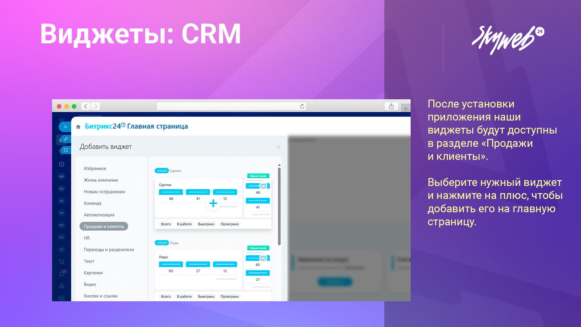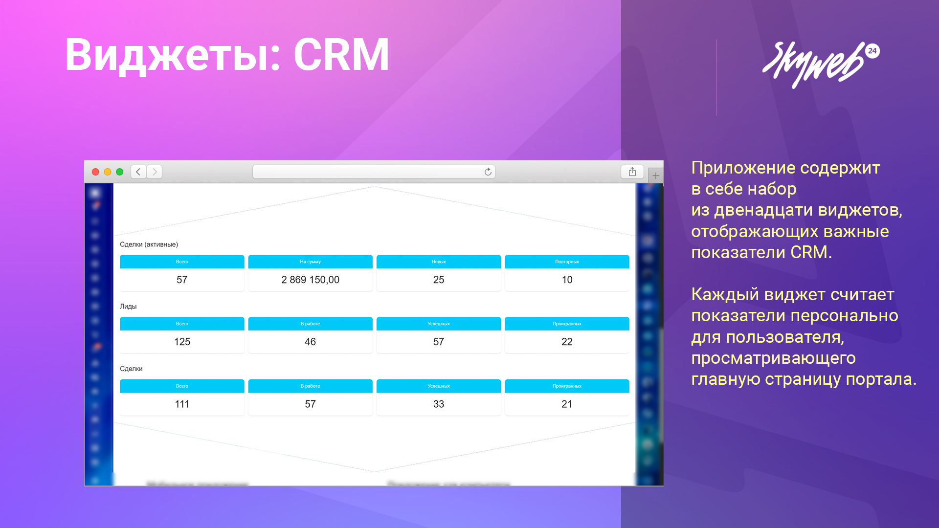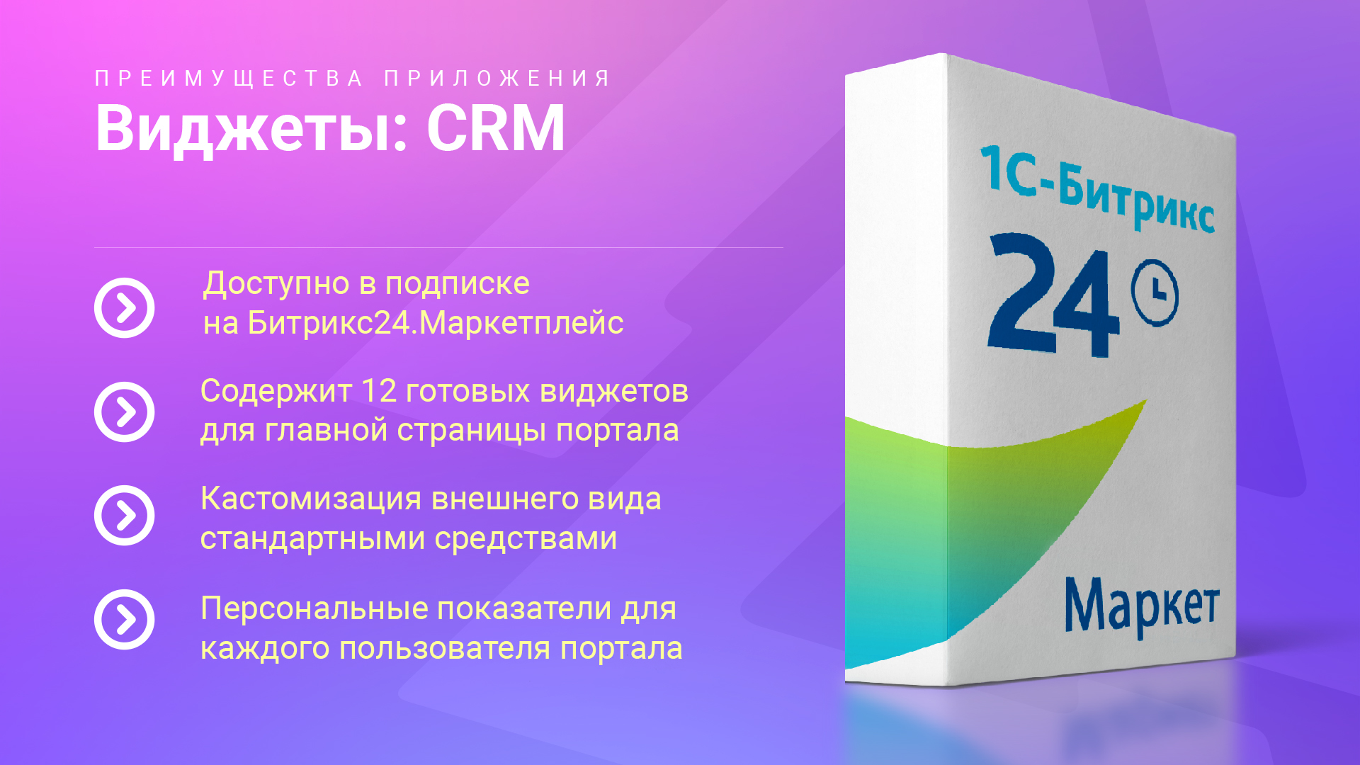 Наше приложение расширяет функционал главной страницы Битрикс24, добавляя готовые наборы виджетов. Набор состоит из 12 виджетов для CRM, которые помогают сотрудникам видеть ключевые показатели прямо при входе на портал.