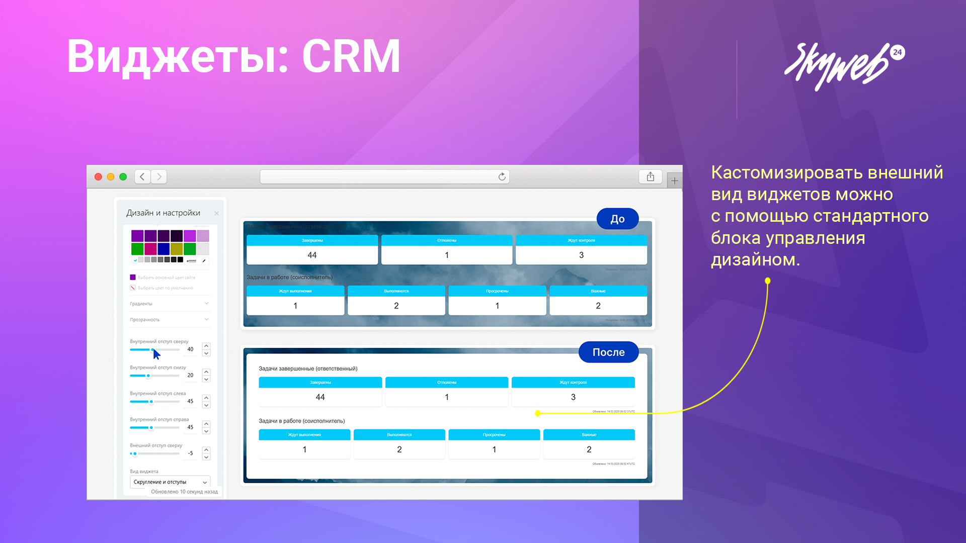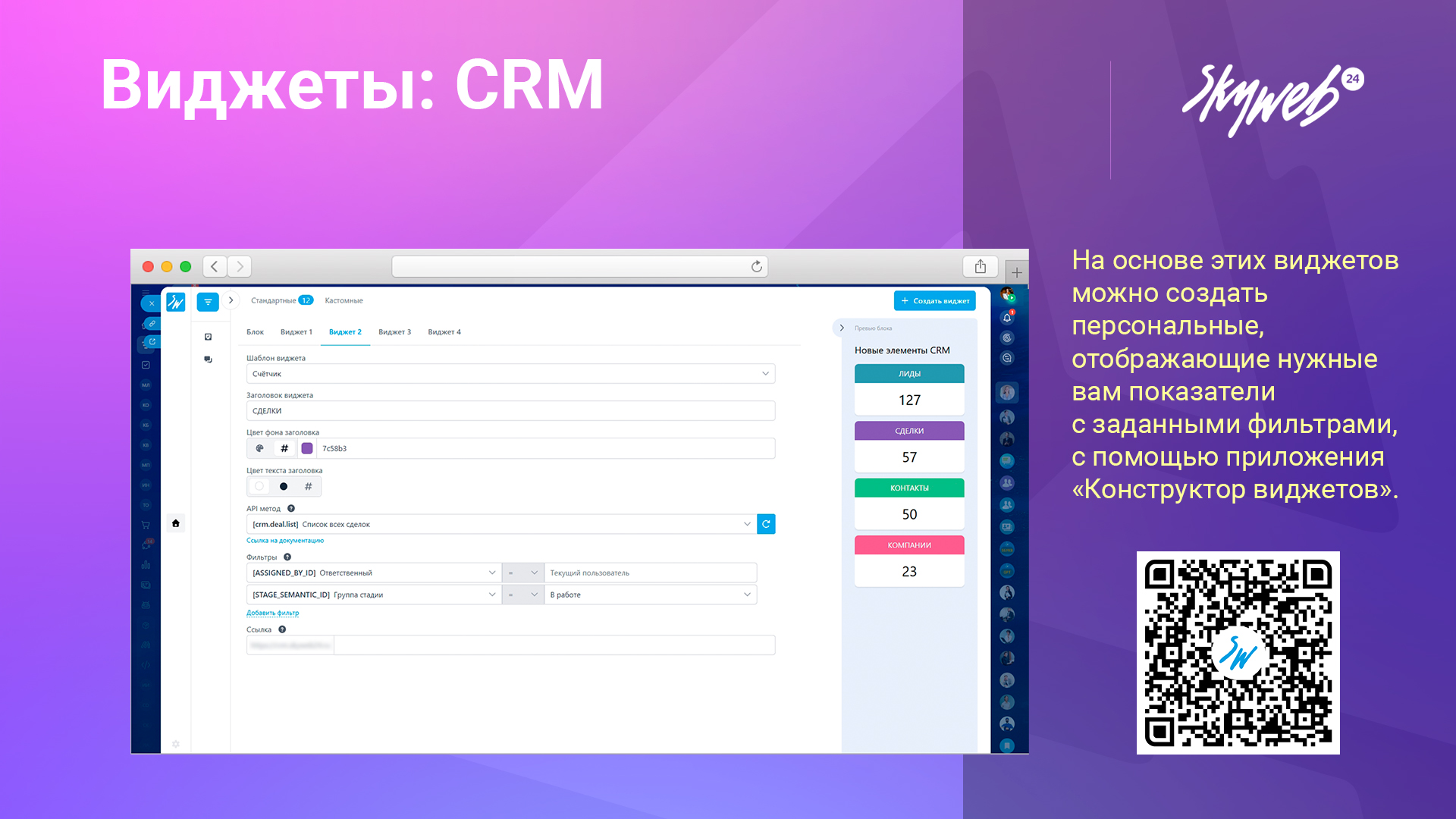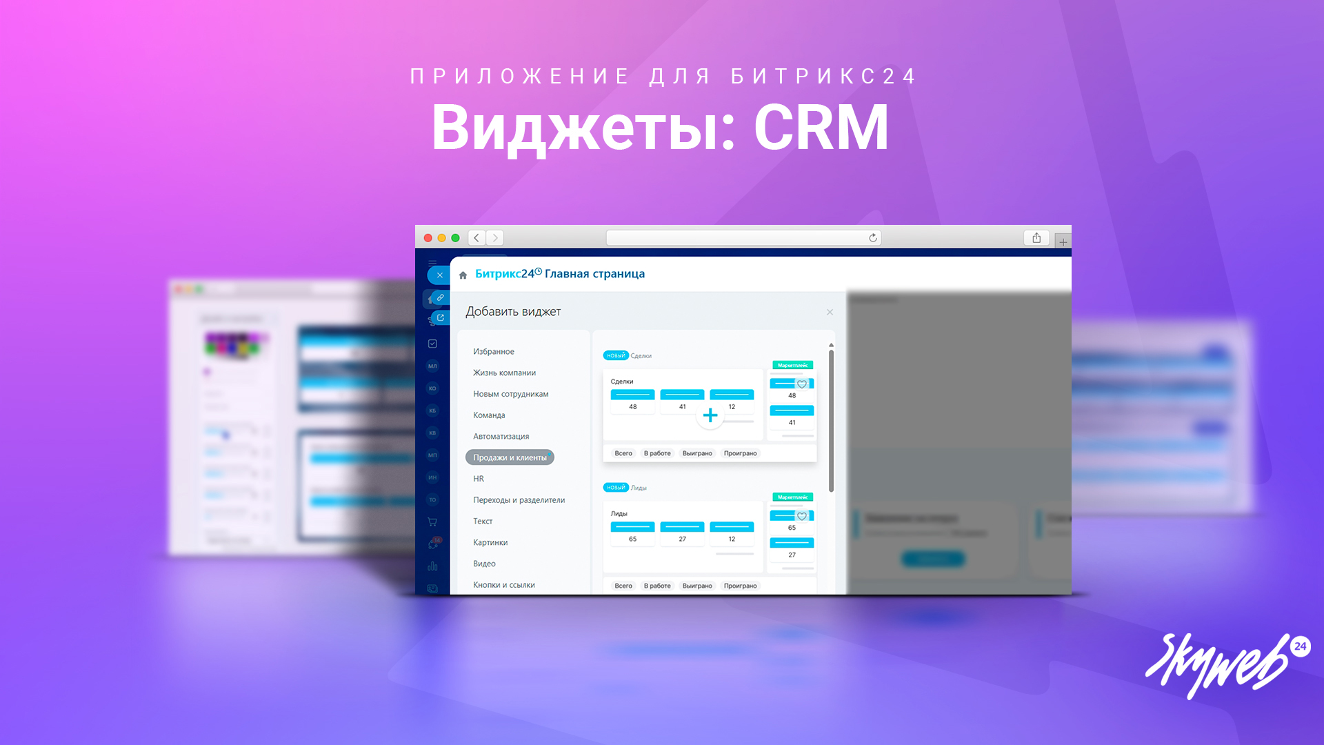 Наше приложение расширяет функционал главной страницы Битрикс24, добавляя готовые наборы виджетов. Набор состоит из 12 виджетов для CRM, которые помогают сотрудникам видеть ключевые показатели прямо при входе на портал.