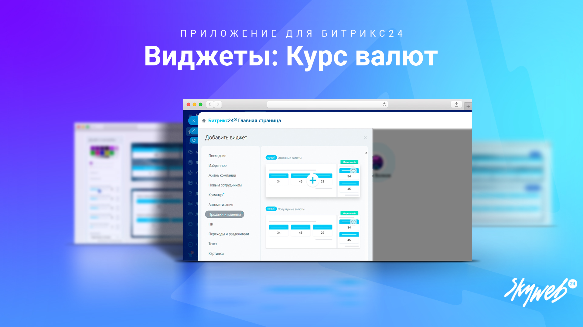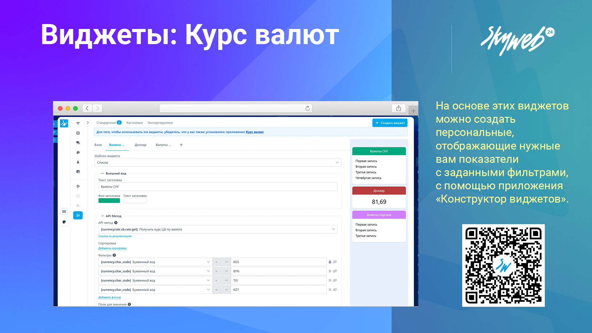 Наше приложение добавляет готовые виджеты на главную страницу Битрикс24, позволяя отслеживать актуальные курсы валют прямо при входе на портал. Данные берутся из нашего приложения «Курс валют», что гарантирует их точность и актуальность.