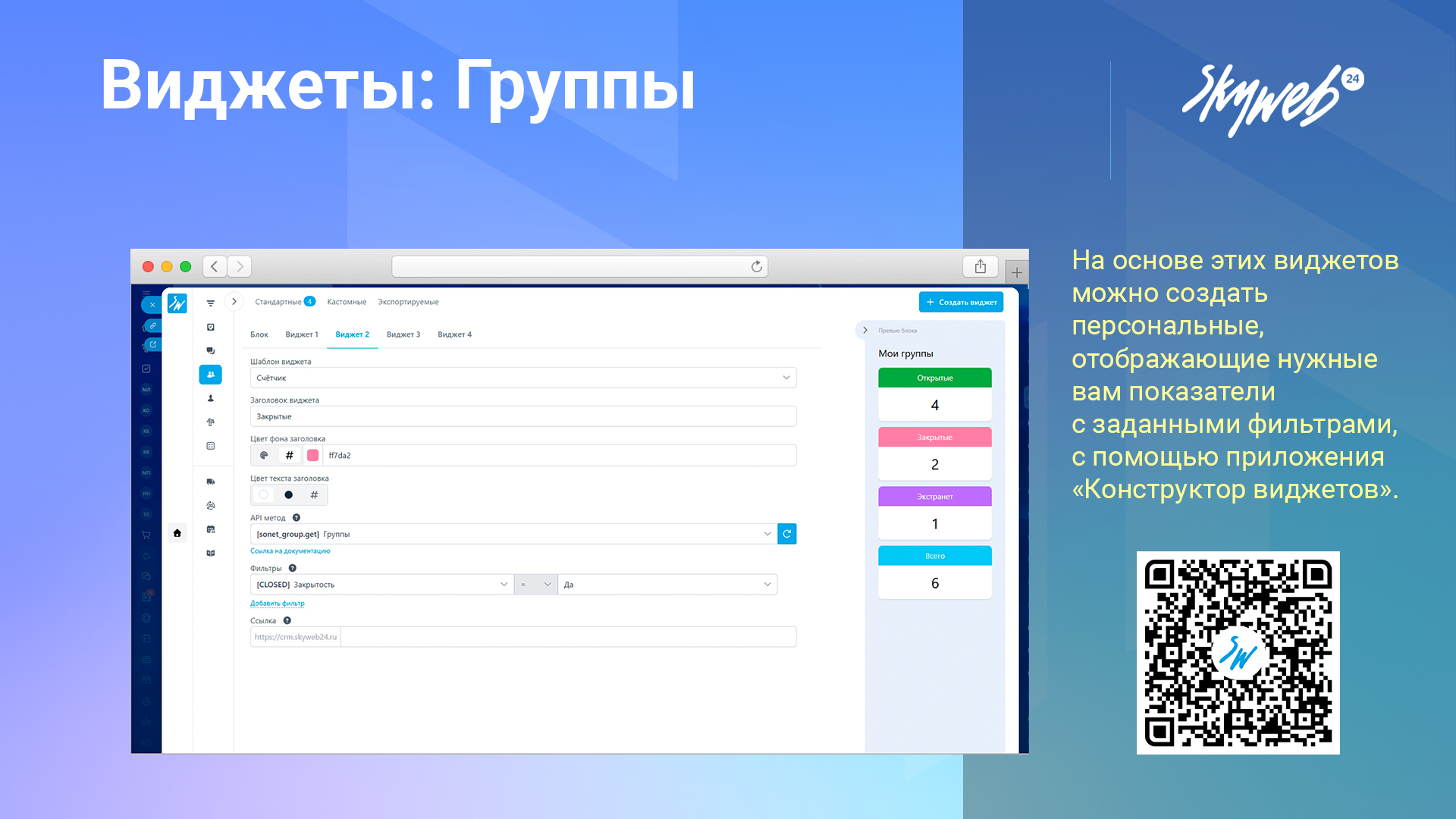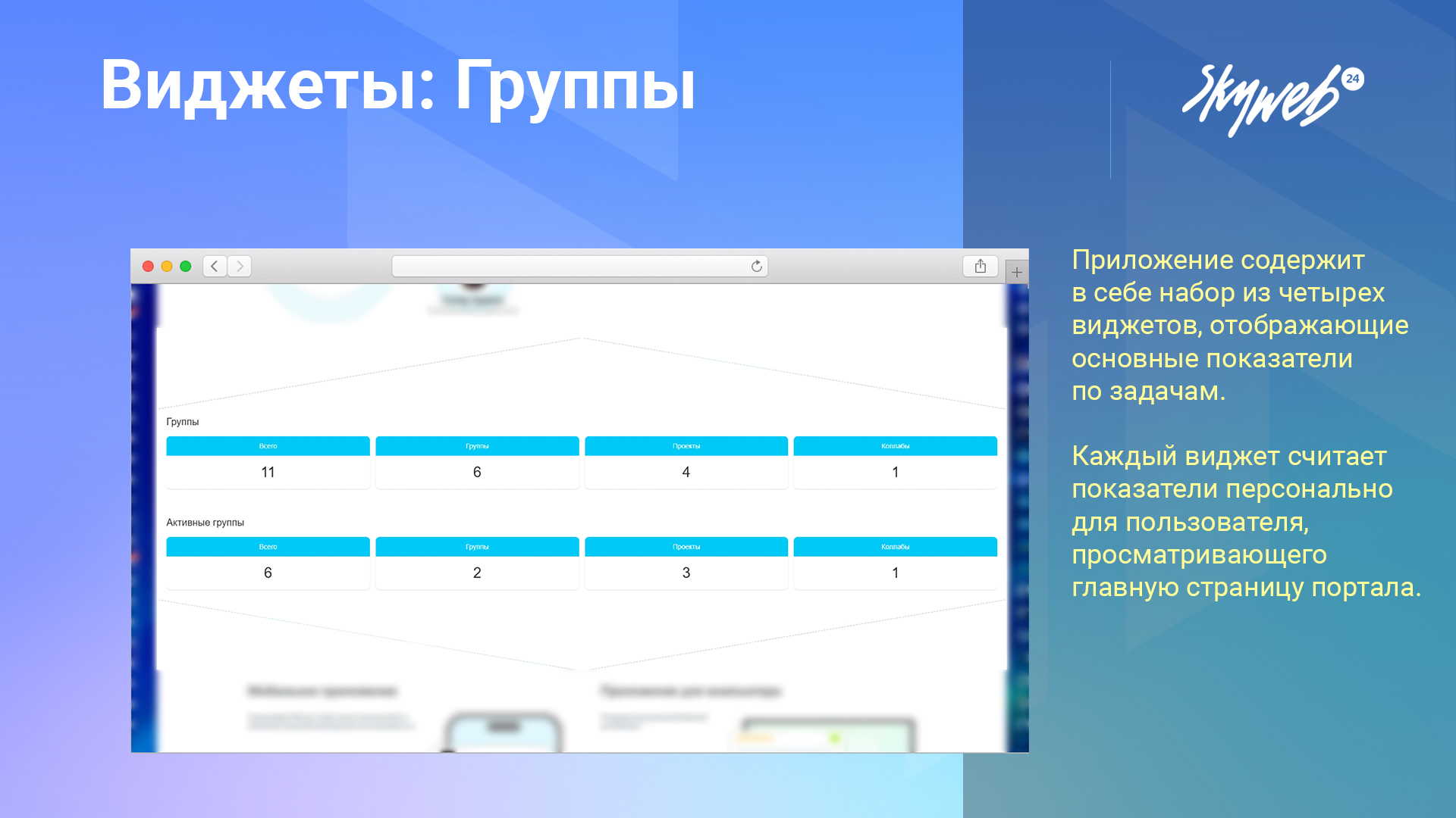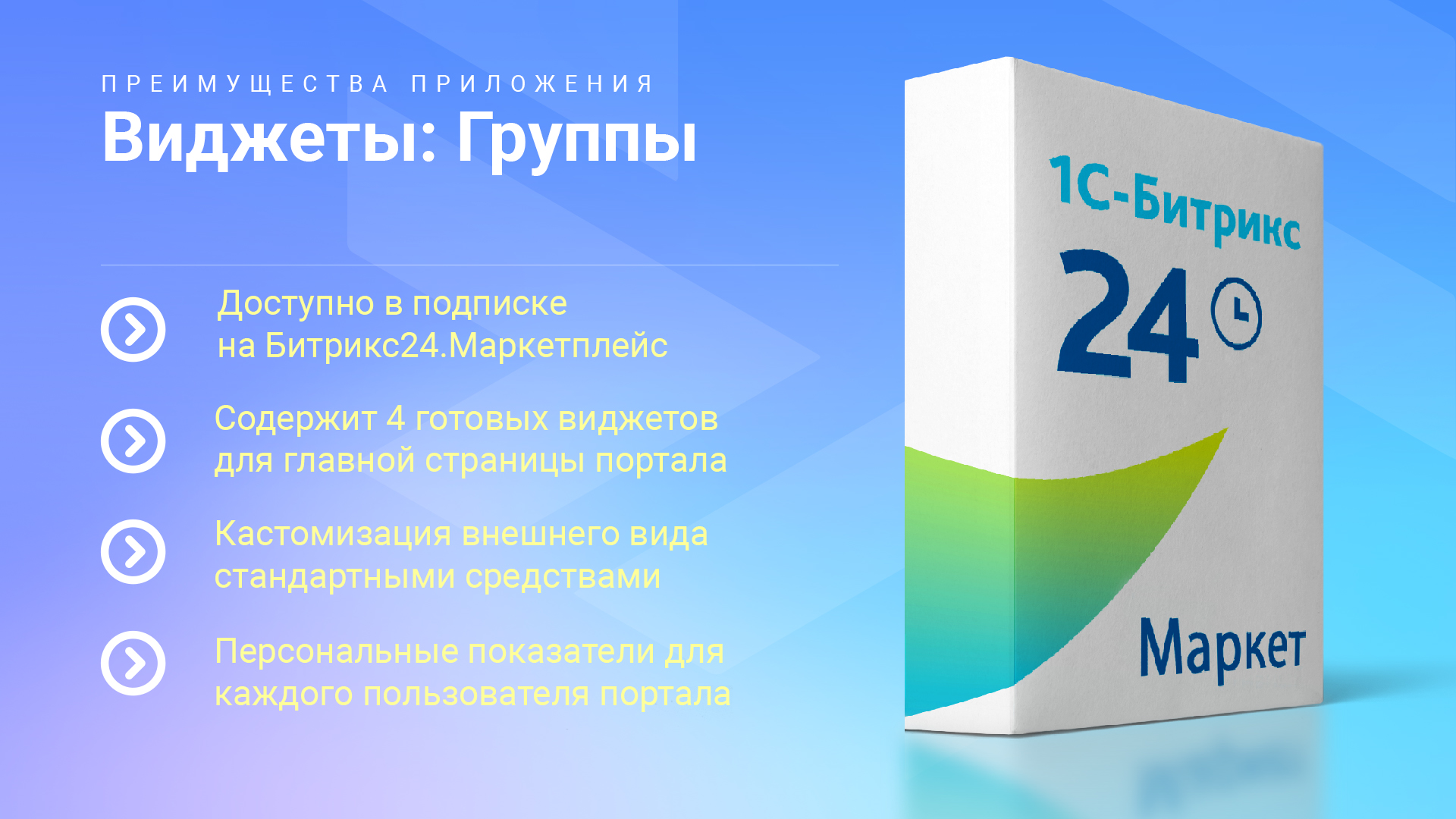 Наше приложение добавляет набор готовых виджетов на главную страницу Битрикс24, позволяя отслеживать количество и типы групп, а также видеть персональные списки прямо при входе на портал.