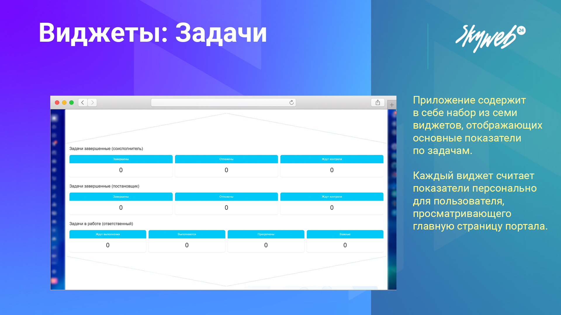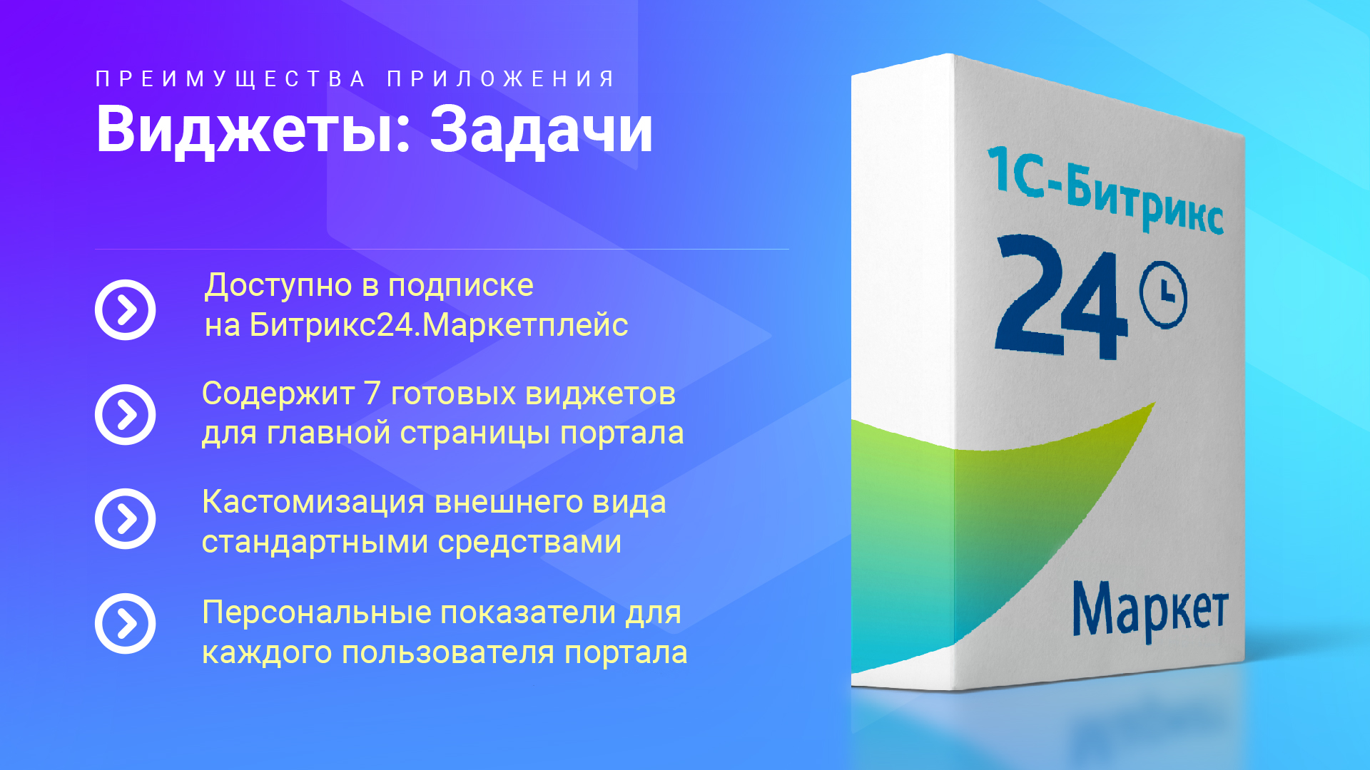 Наше приложение расширяет главную страницу Битрикс24, добавляя готовые наборы виджетов. Набор состоит из 7 виджетов для задач, которые помогают сотрудникам видеть актуальные показатели и контролировать выполнение прямо при входе на портал.