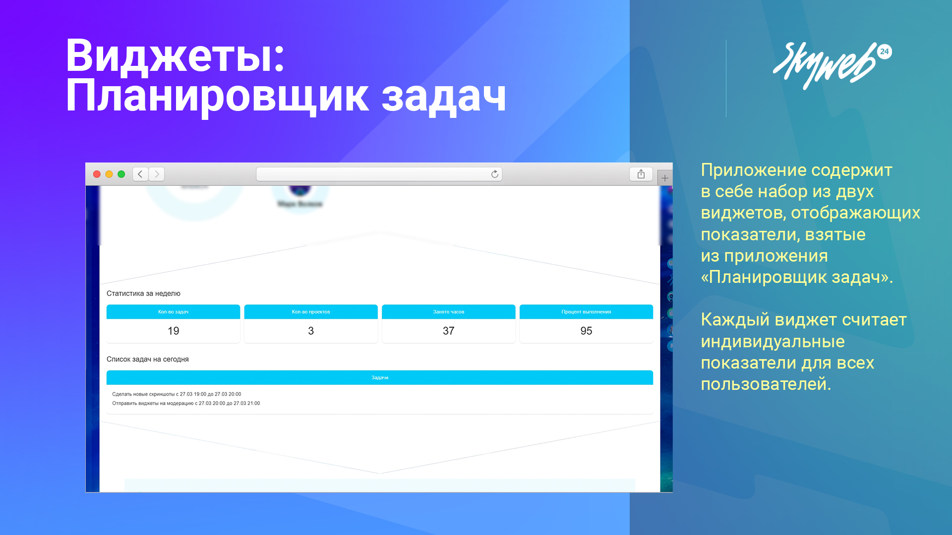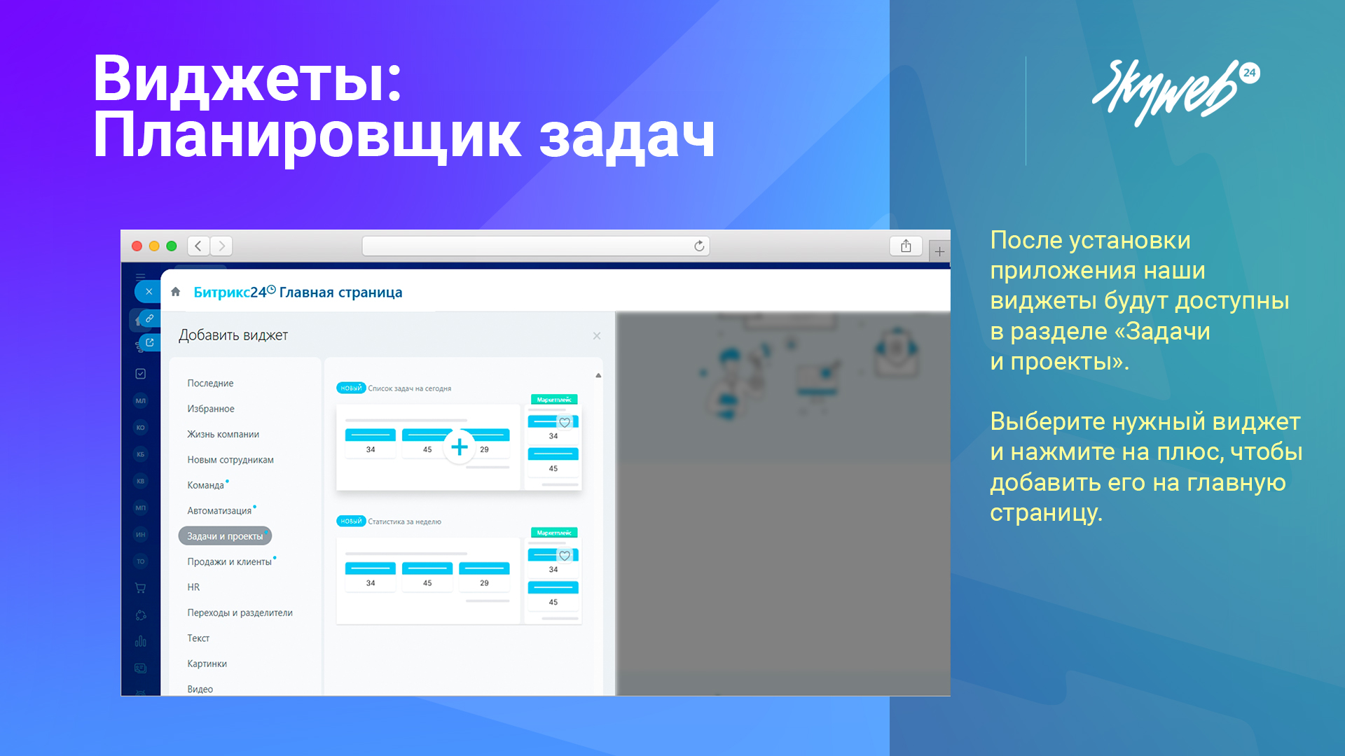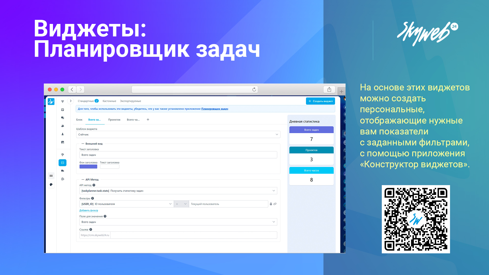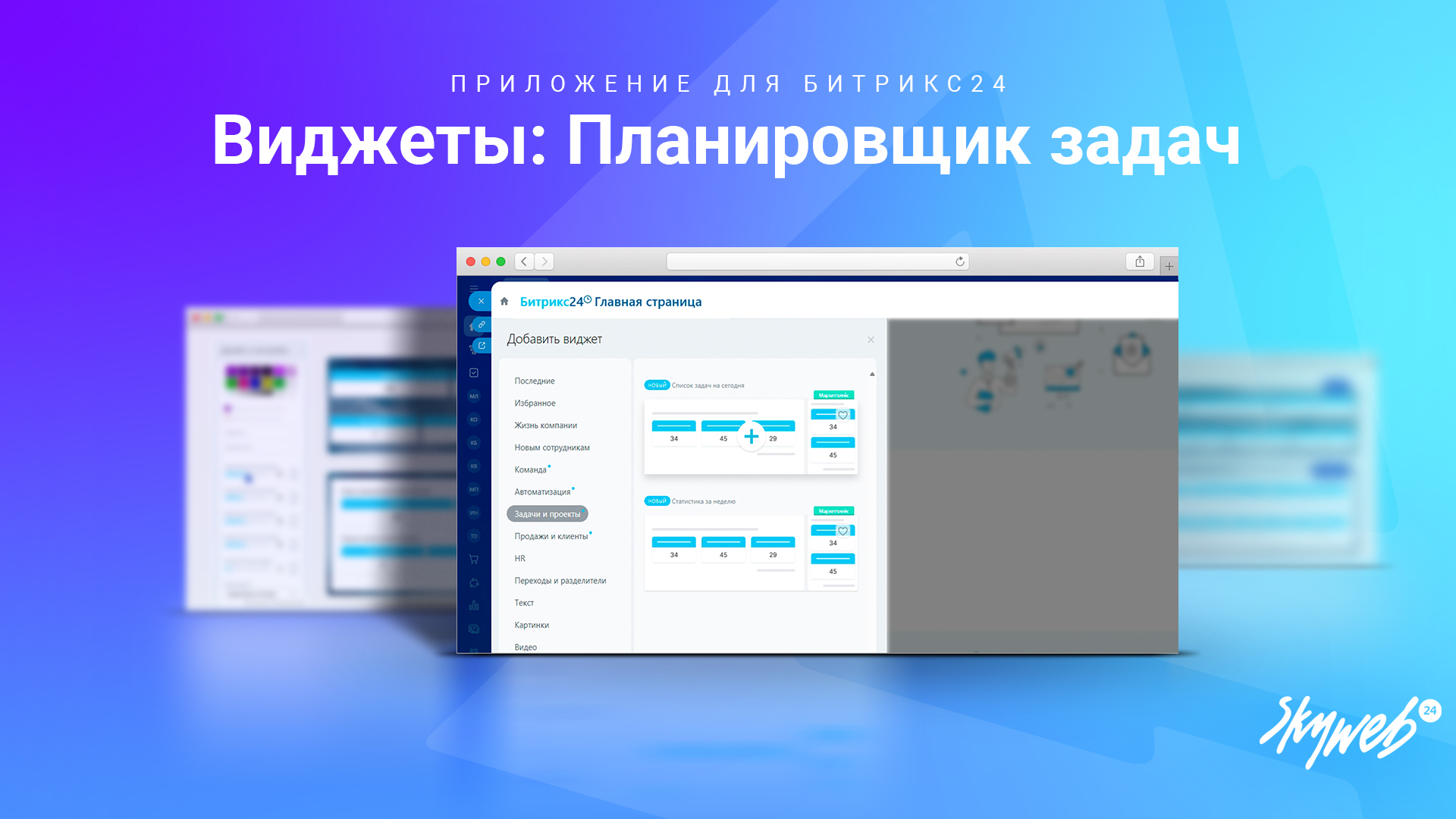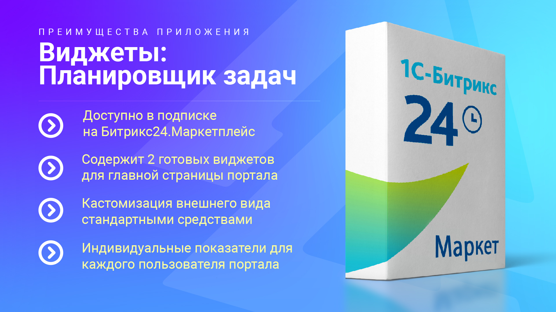 Наше приложение добавляет готовые виджеты на главную страницу Битрикс24, позволяя сотрудникам видеть актуальные задачи и статистику прямо при входе на портал. Данные берутся из приложения «Планировщик задач», что обеспечивает их точность и актуальность.