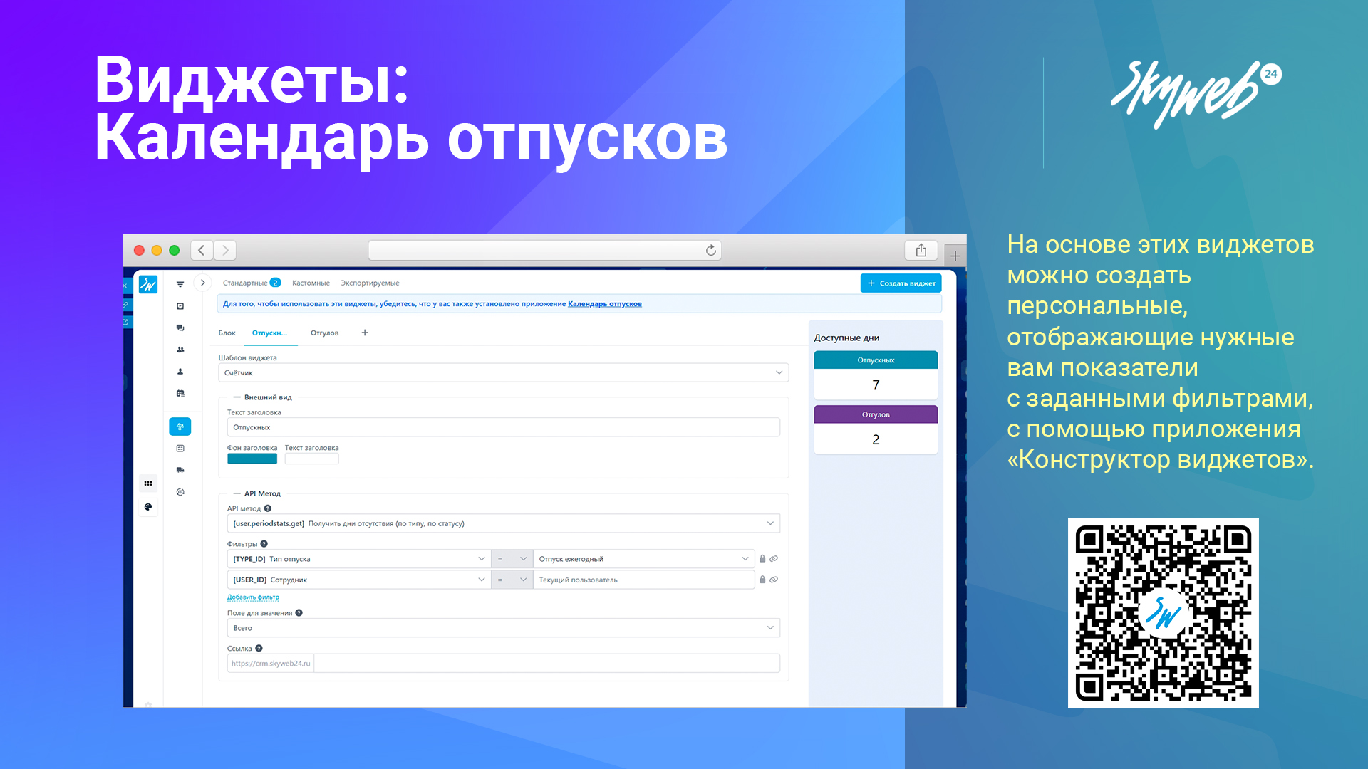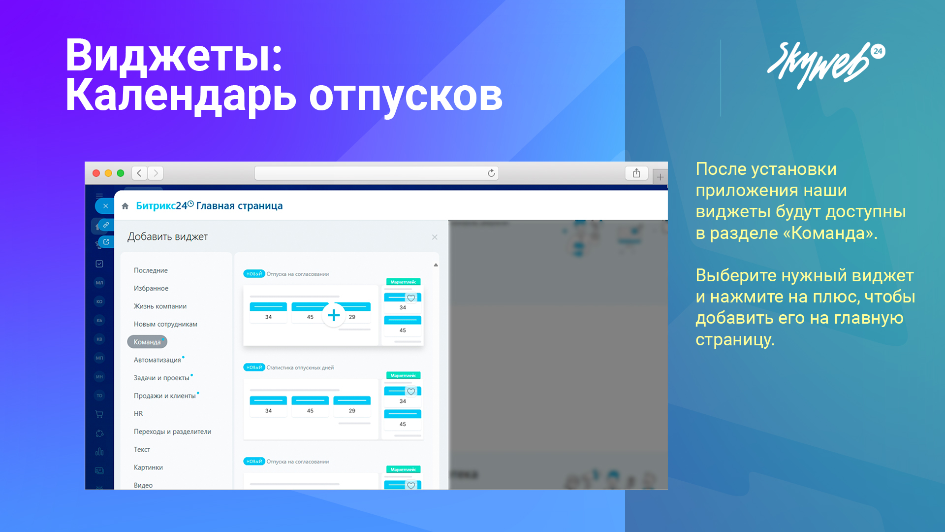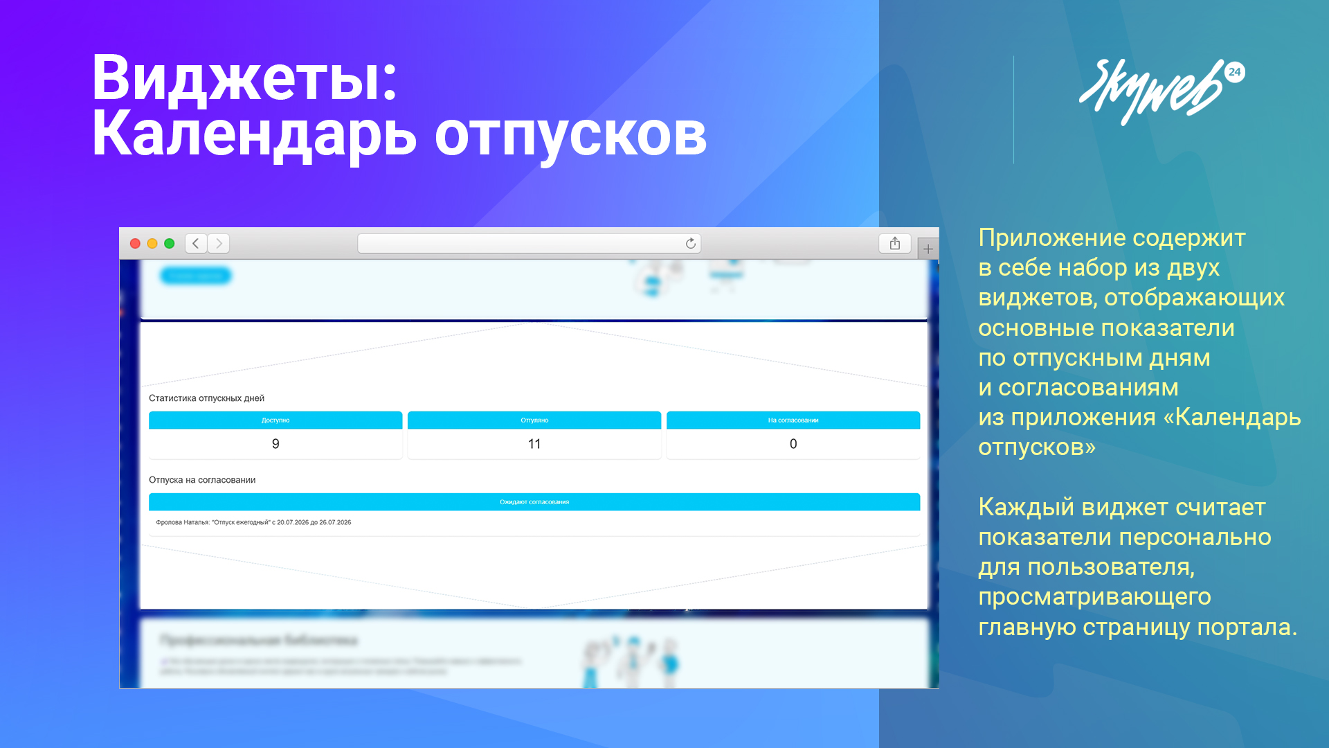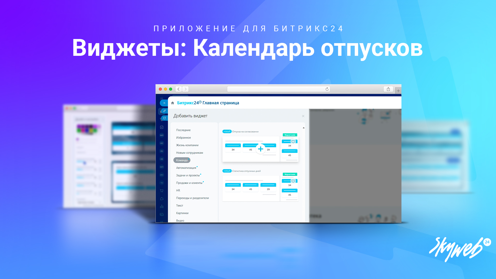 Наше приложение добавляет готовые виджеты на главную страницу Битрикс24, позволяя сотрудникам и руководителям видеть актуальные данные по отпускам. Данные берутся из приложения «Календарь отпусков» и автоматически отображаются на портале.