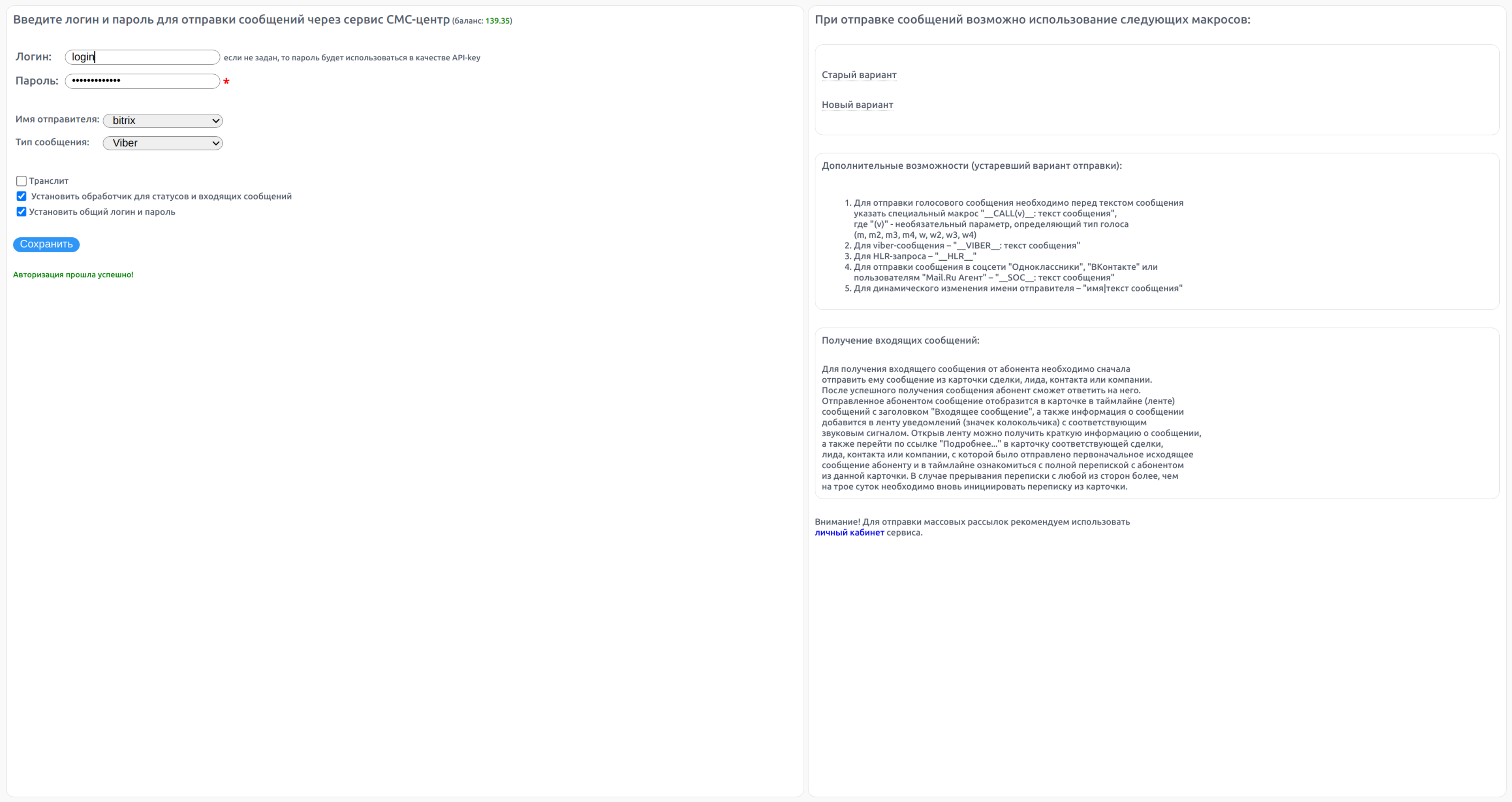 Приложение позволяет отправлять сообщения из бизнес-процессов, роботов и карточек CRM через сервис СМС-центр.