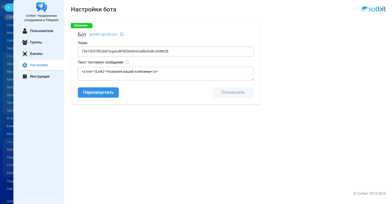 | Документация Подробная документация на Сотбит: Уведомление сотрудников. в Telegram позволит максимально упростить процесс изучения особенностей приложения. | ![]() |