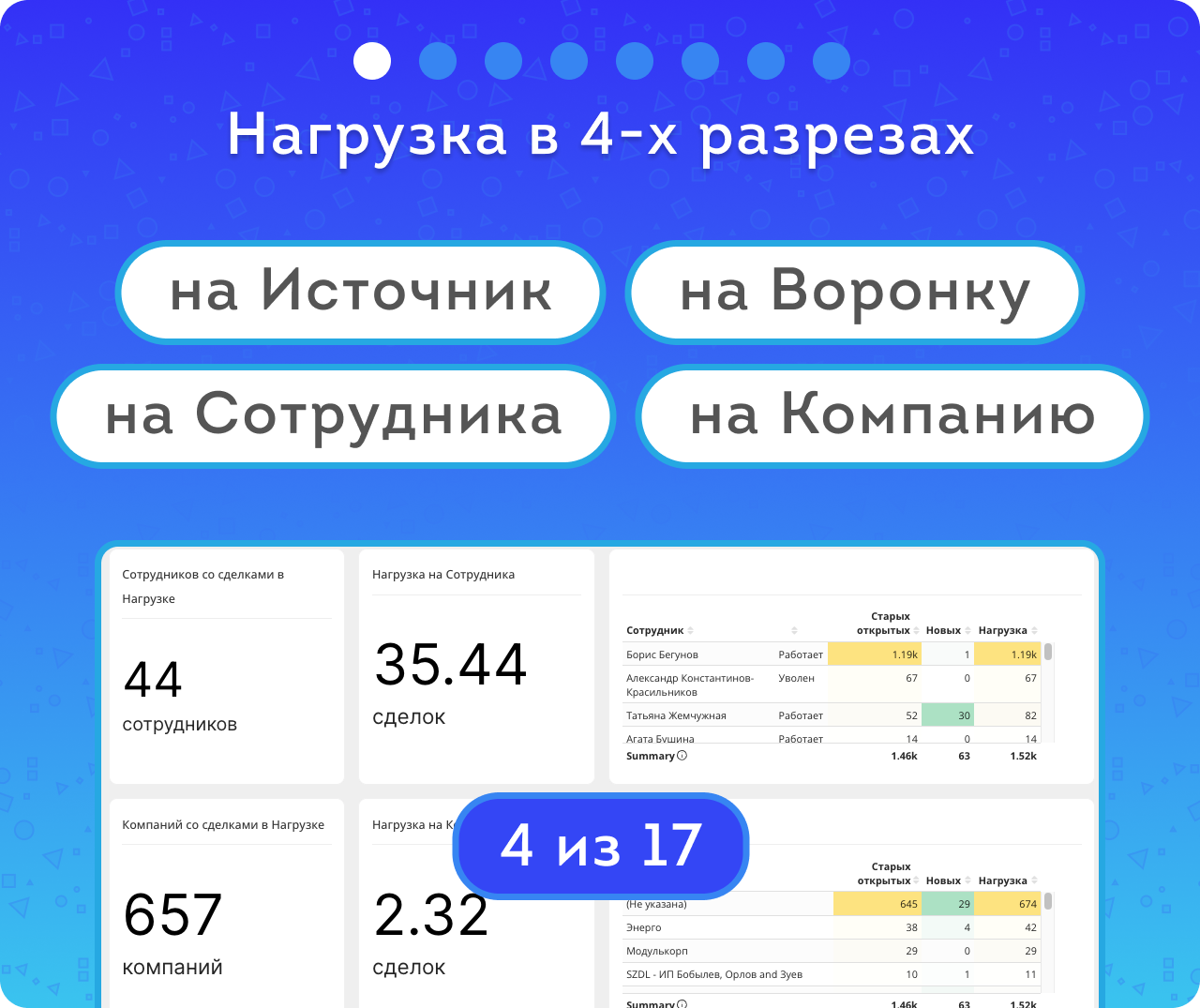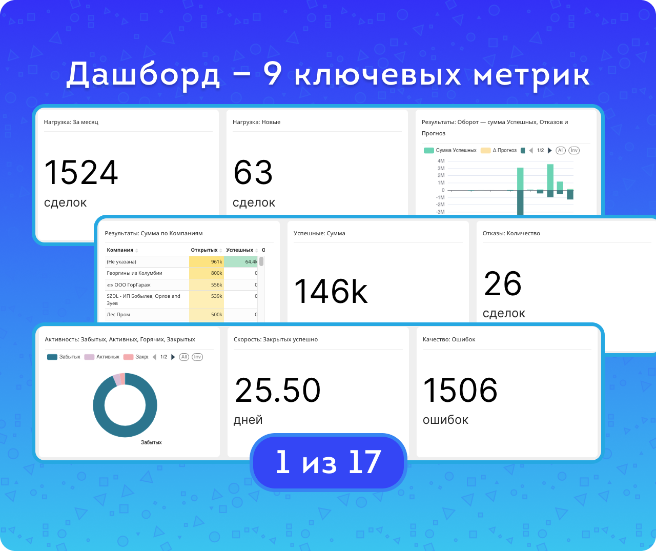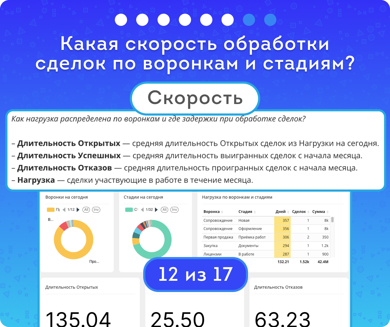 Позволит моментально оценить загрузку, темп продаж и качество ведения CRM, а также понять, какие зоны требуют внимания прямо сейчас: