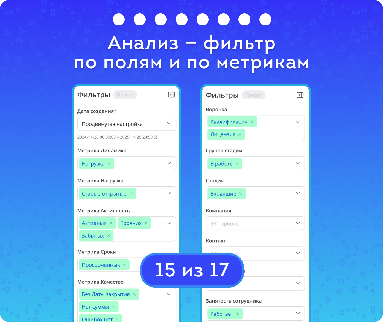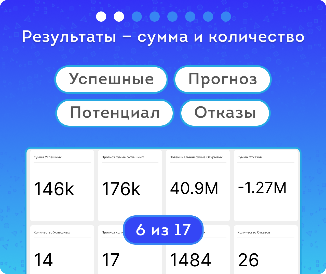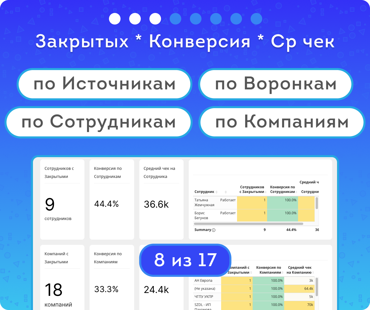 Позволит моментально оценить загрузку, темп продаж и качество ведения CRM, а также понять, какие зоны требуют внимания прямо сейчас: