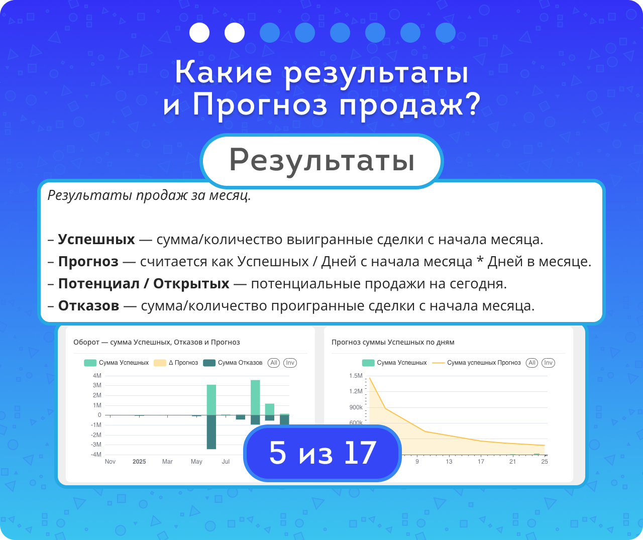 Результаты: Оборот — сумма Успешных, Отказов и Прогноз — график с суммами закрытых сделок по месяцам и прогноз на текущий месяц.