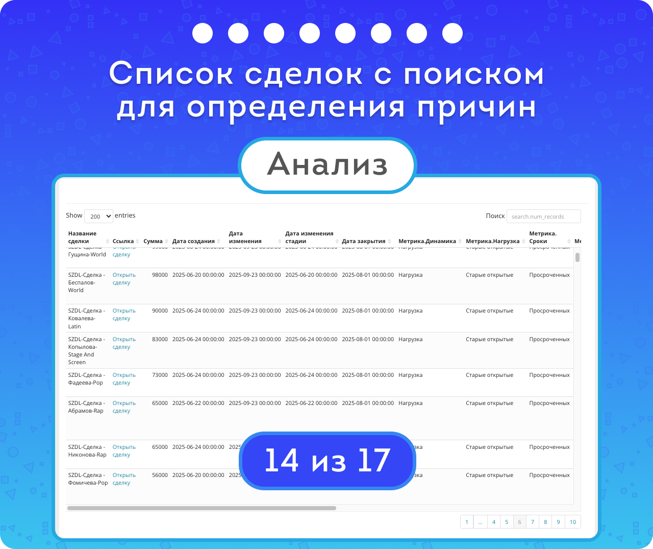 Таблица с полным списком сделок. Она позволяет сортировать данные, быстро находить нужные строки с помощью поиска, а также переходить по активным ссылкам в сами сделки. Это полезно для детального разбора и оперативных проверок.