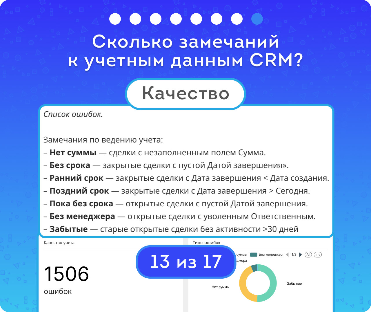 Качество: Ошибок — общее количество любых ошибок в сделок: без сумм, коллизии с Датой завершения, забытые или без менеджера.