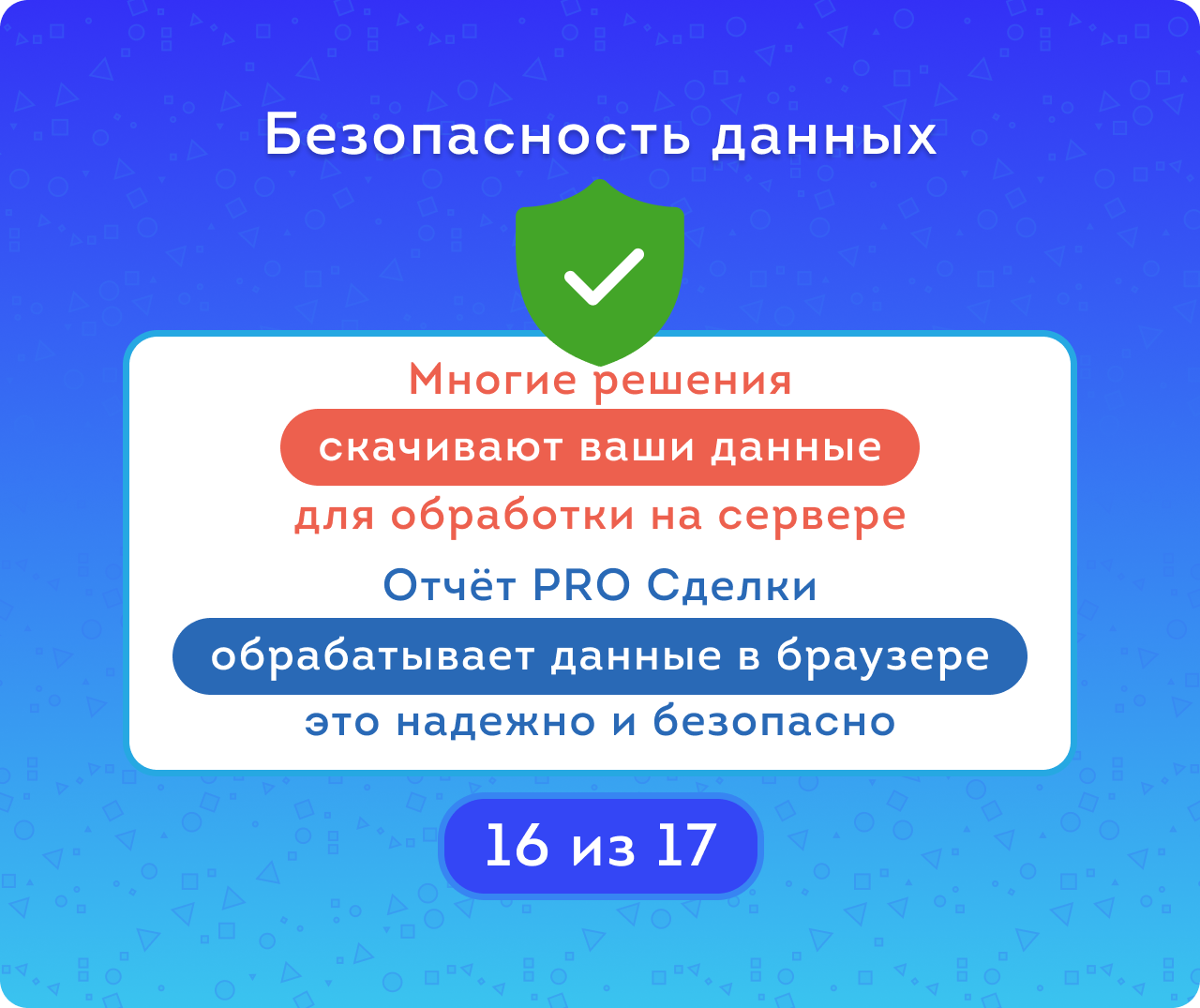 Отчёт PRO Сделки — полноценный инструмент для управления продажами. Он поможет руководителю получить картину всего происходящего в отделе продаж, разобраться в причинах, повысить эффективность команды и найти точки роста. А если нужно оценить загрузку и состояние задач всей команды, используйте Отчёт PRO Задачи — в нём больше ста метрик, и он отлично дополняет аналитику руководителя.