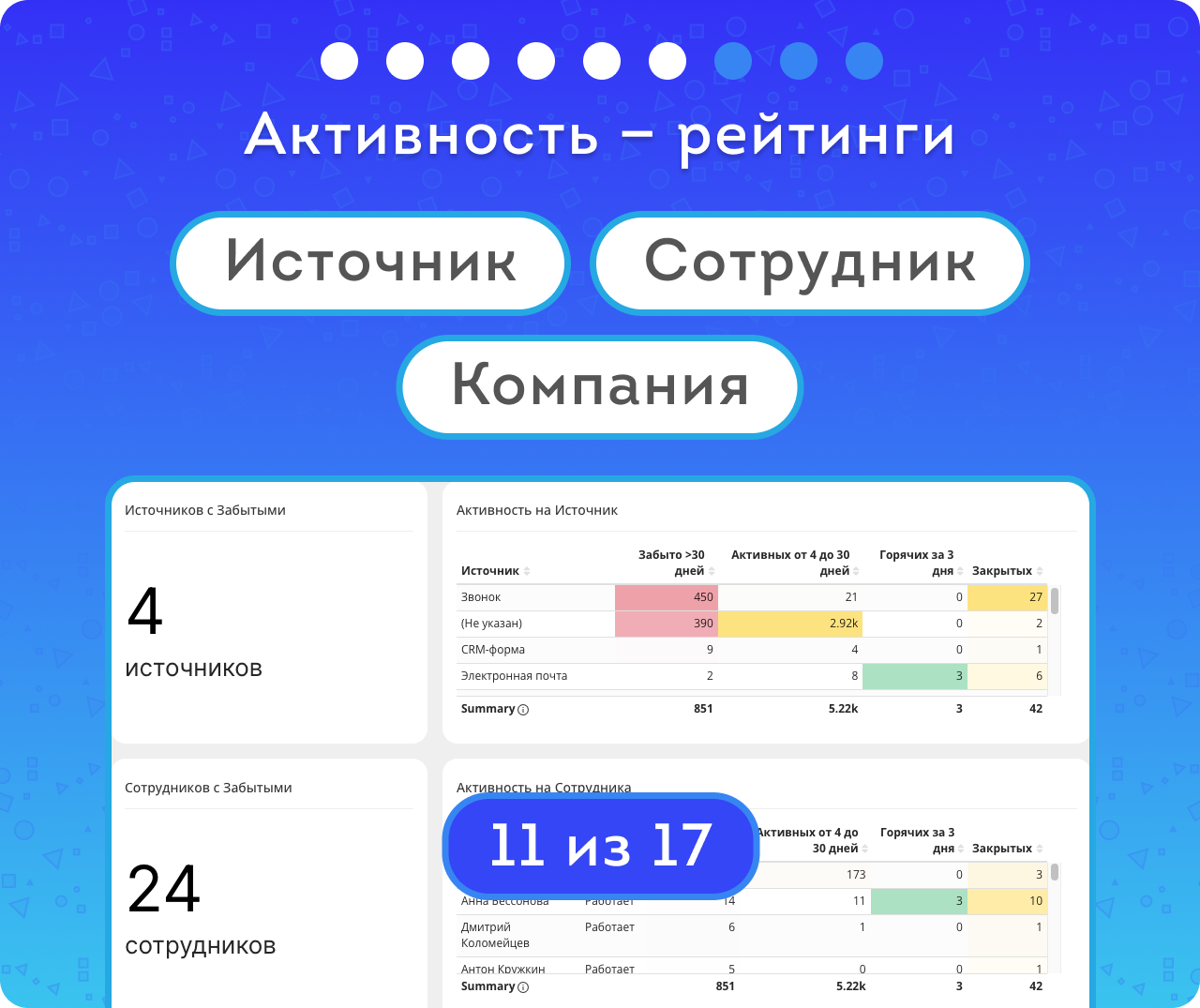 метрикам Активности (Активные / Горячие / Забытые / Закрытые);