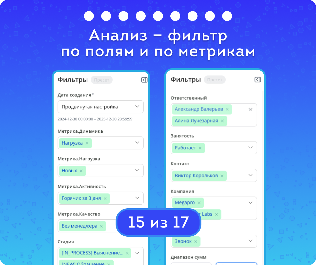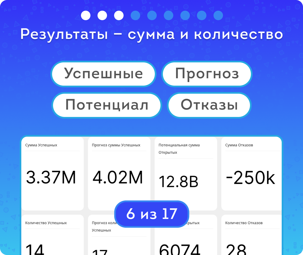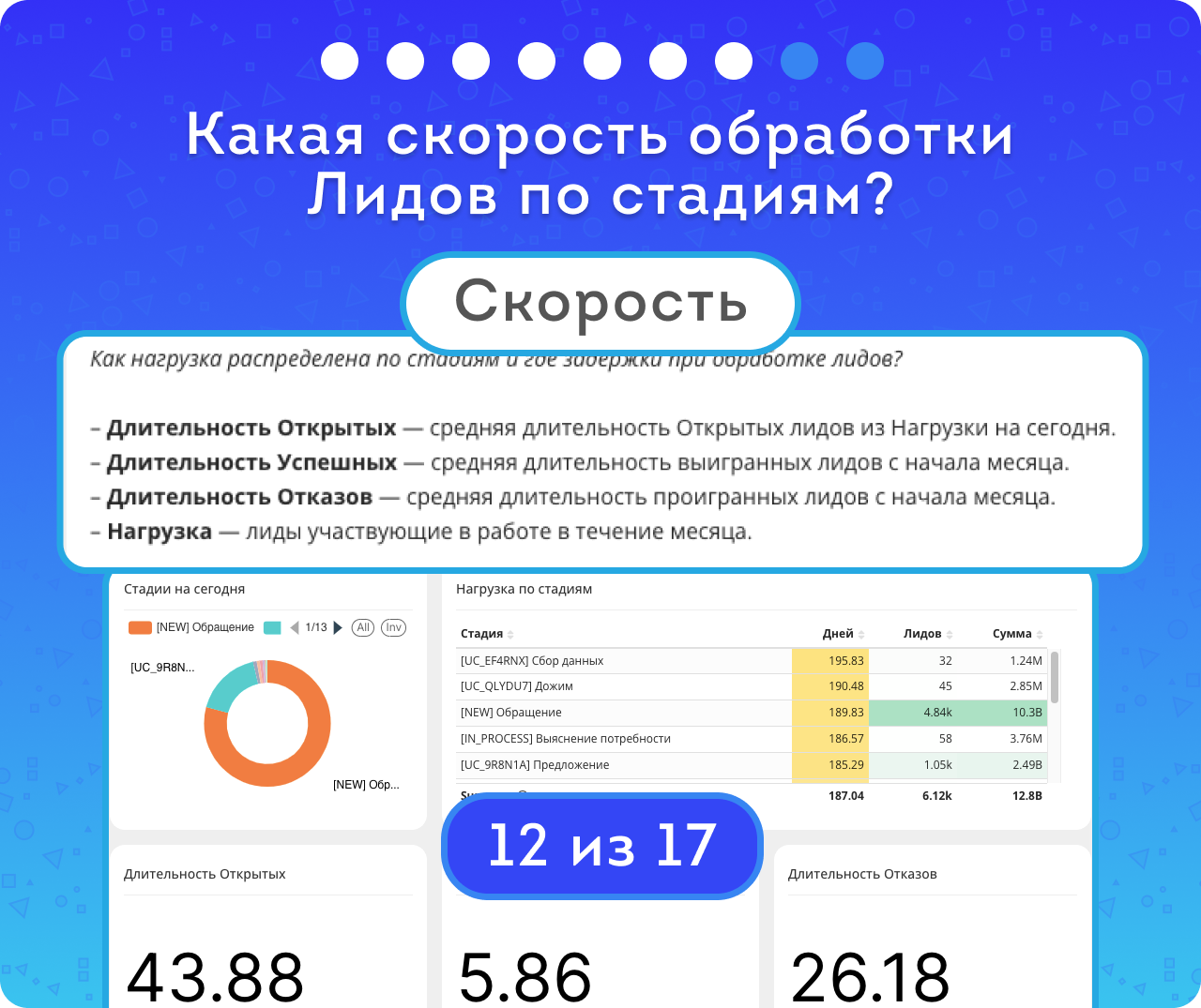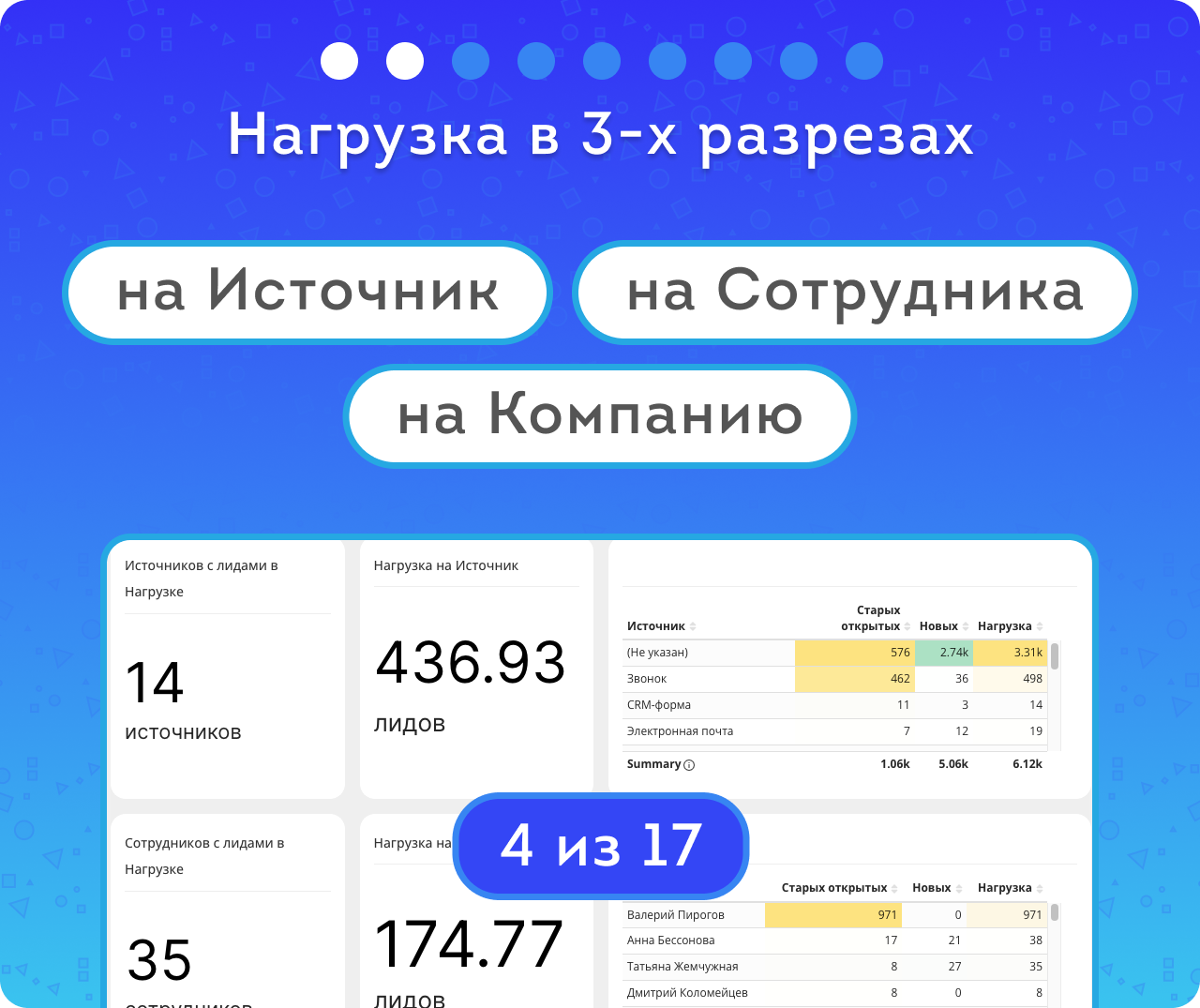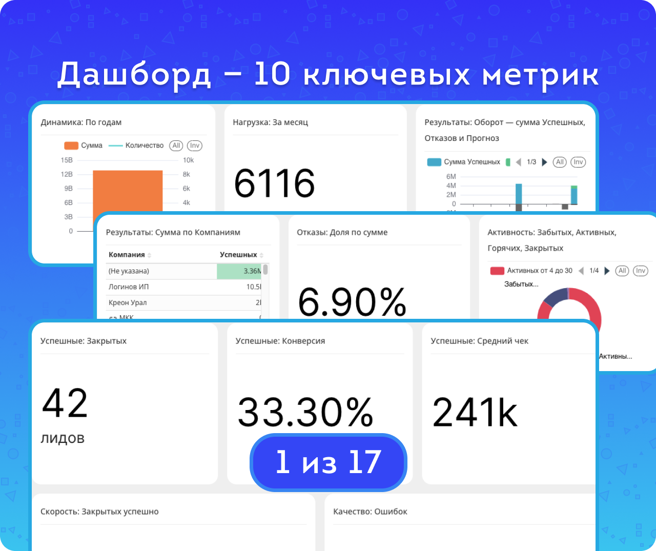 Позволит моментально оценить загрузку, темп и качество ведения CRM, а также понять, какие зоны требуют внимания прямо сейчас: