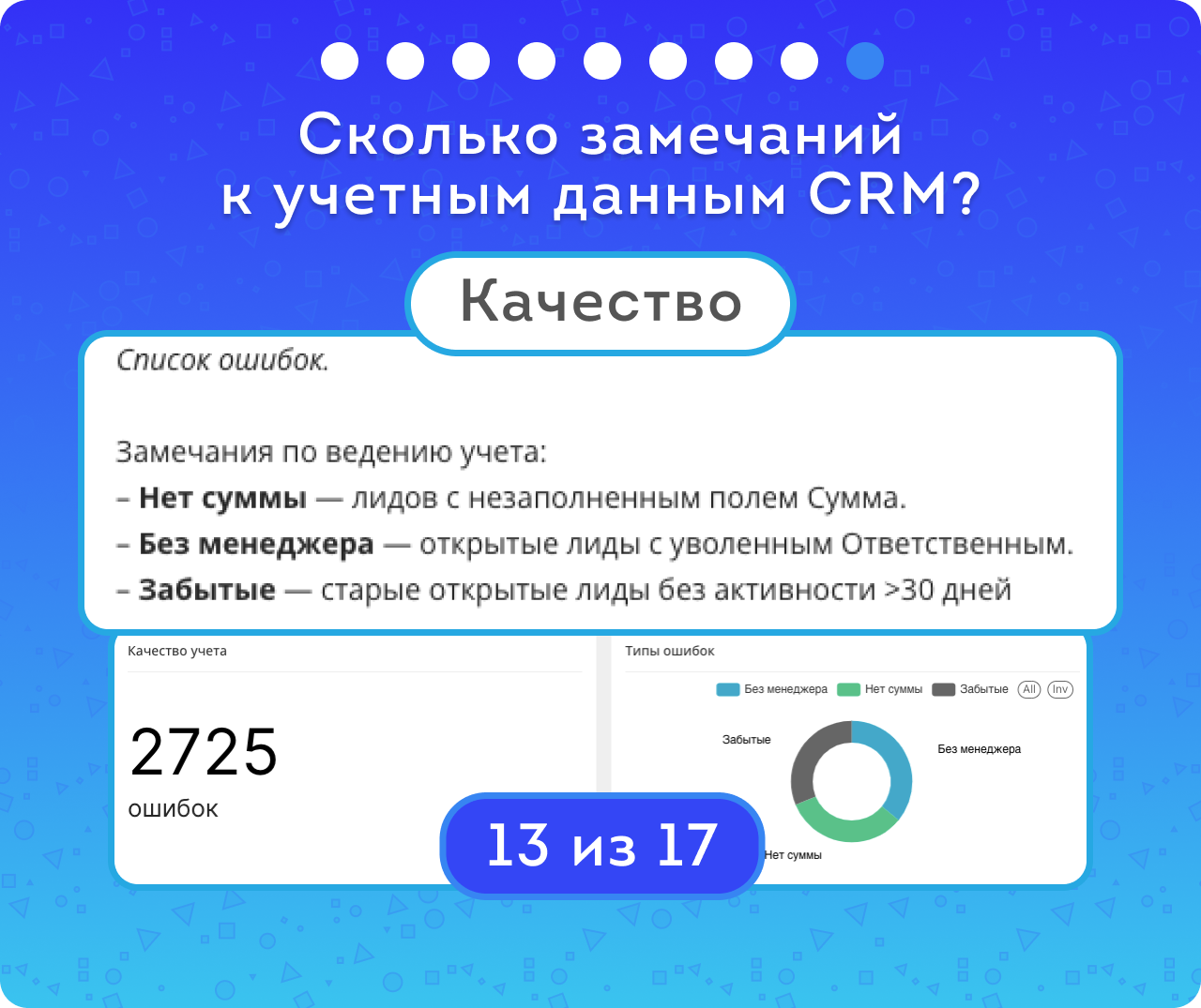 Качество: Ошибок — общее количество любых ошибок в лидах: без сумм, забытые или без менеджера.