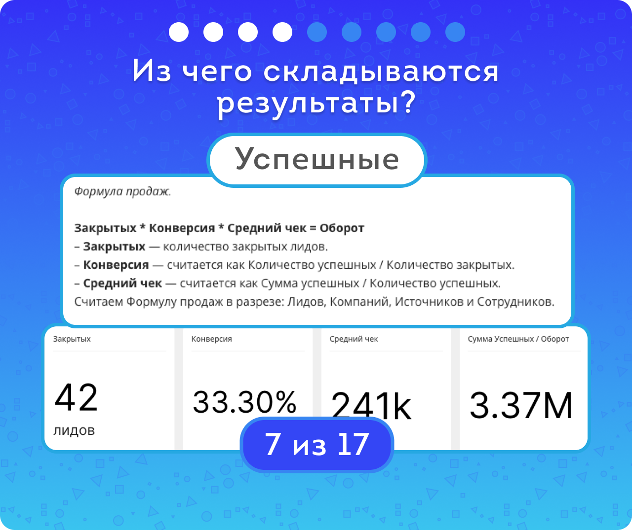 Формула: Закрытых * Конверсия * Средний чек = Оборот. При этом Конверсия — это Количество успешных / Количество закрытых, а Средний чек —это Сумма успешных / Количество успешных.