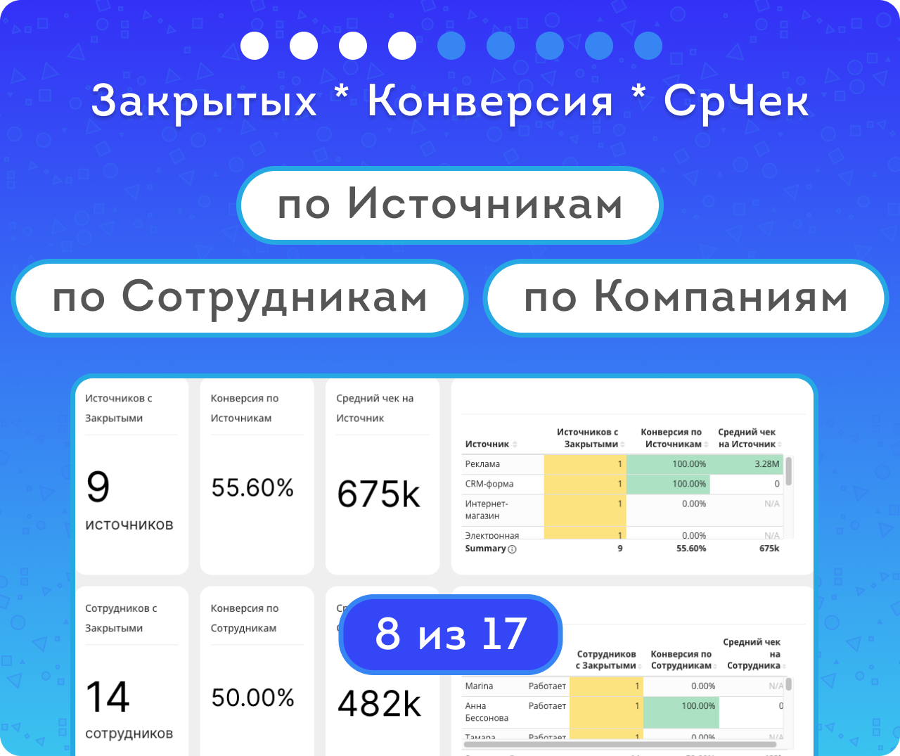 Таблицы по источникам, сотрудникам и компаниям помогают выявить причины потерь и слабые этапы цикла.