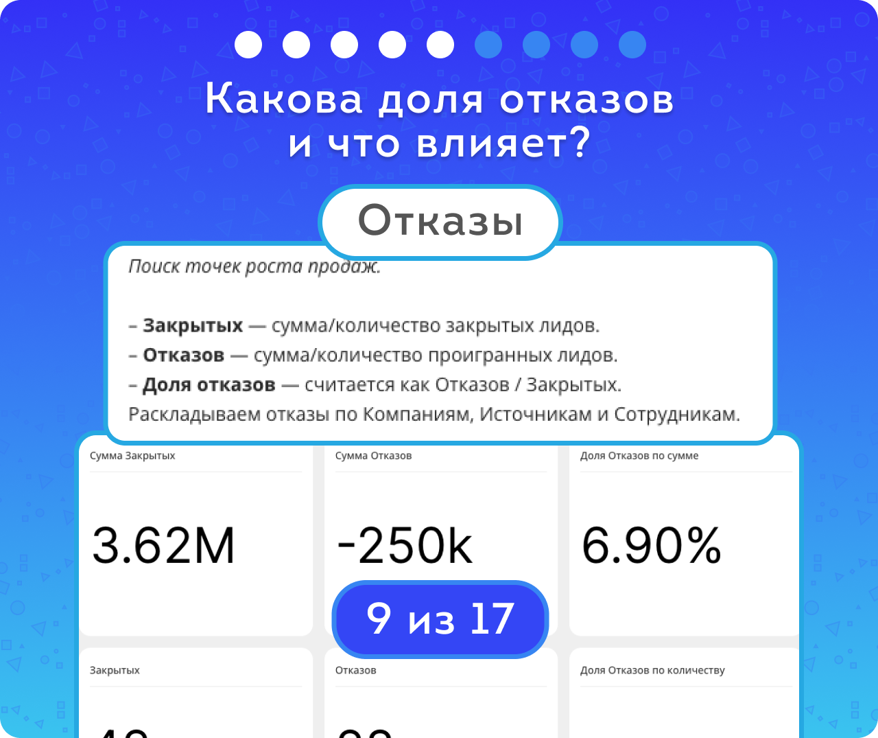 Анализируется сумма и количество забракованных лидов а также Доля отказов — считается как Отказов / Закрытых.