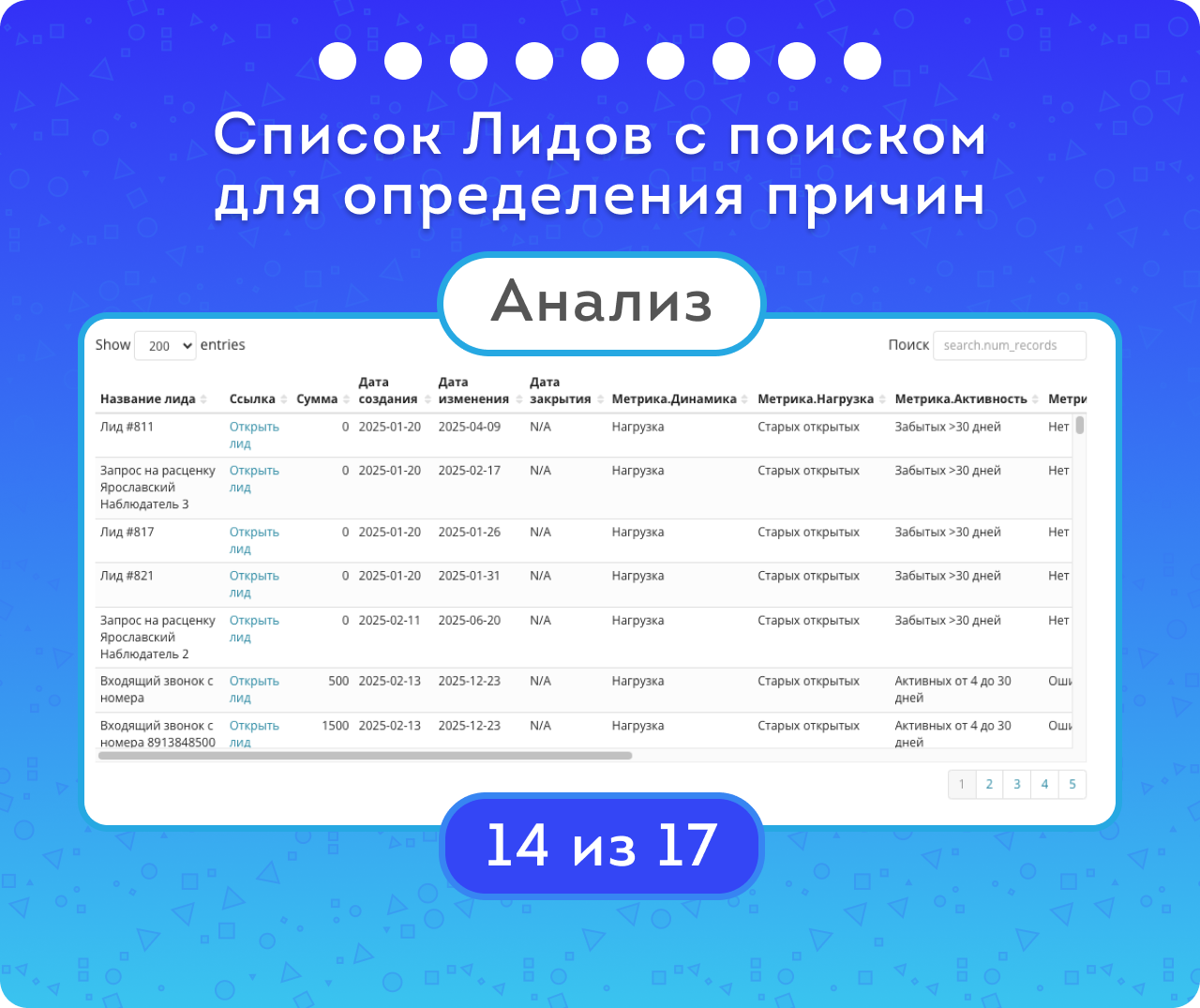 Таблица с полным списком лидов. Она позволяет сортировать данные, быстро находить нужные строки с помощью поиска, а также переходить по активным ссылкам в сами лиды. Это полезно для детального разбора и оперативных проверок.