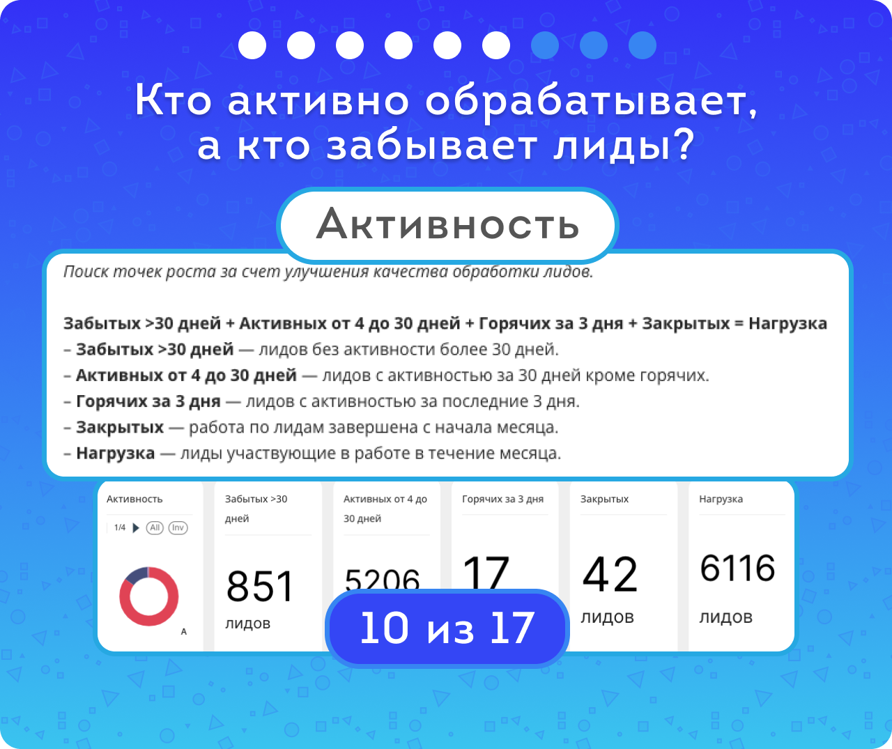 Под активностью подразумевается любое изменение в лидах — дела, письма, звонки, заполнения полей и тд. Выявляются нарушения дисциплины, перегруженные сотрудники и клиенты, требующие быстрого реагирования.