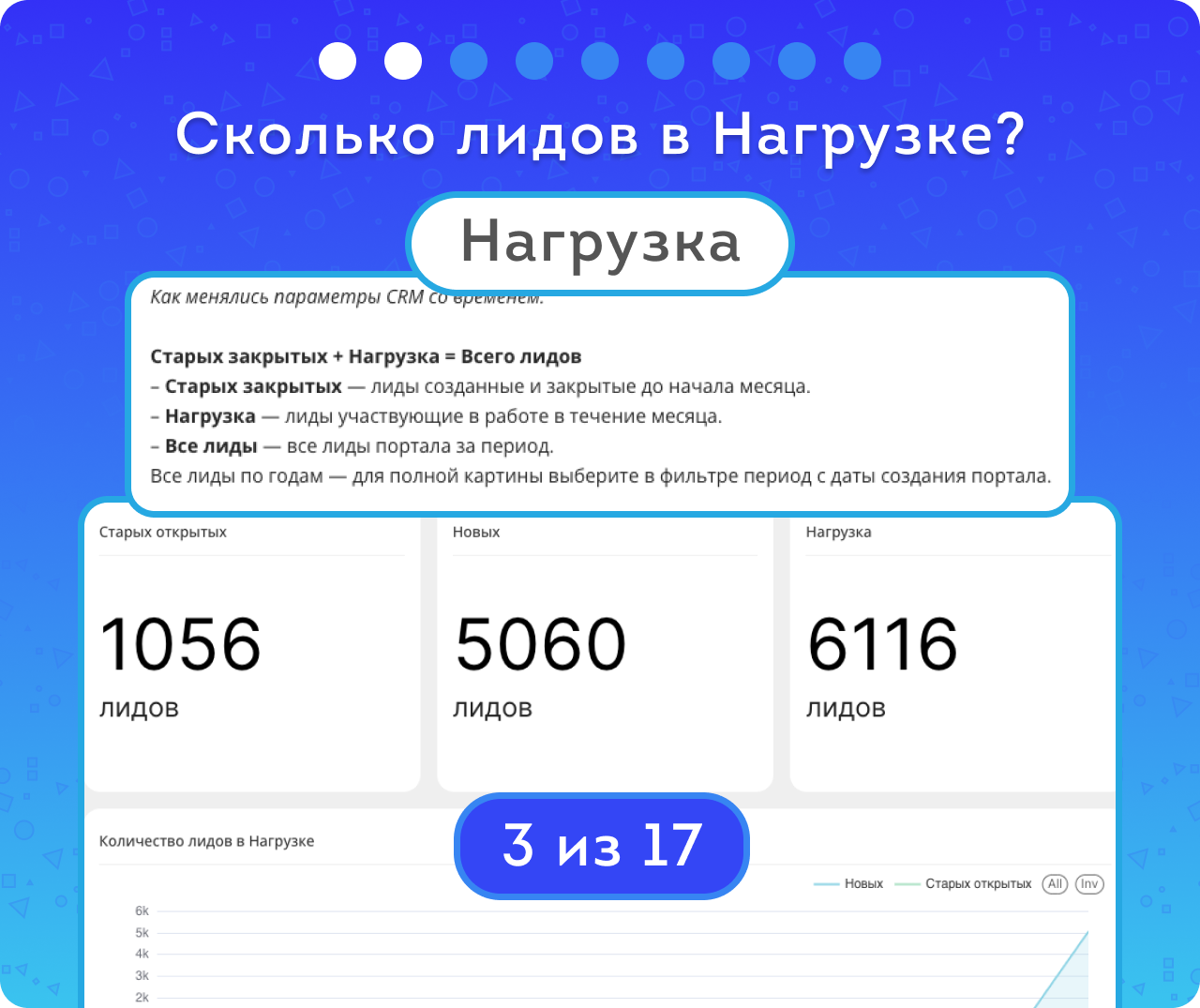 Отвечает на вопрос: сколько лидов сейчас в работе и из чего складывается текущий объём? Лиды из Нагрузки разделяются на Старые открытые (создано до начала текущего месяца и не закрыто на начало этого же месяца) и Новые (создано в этом месяце).