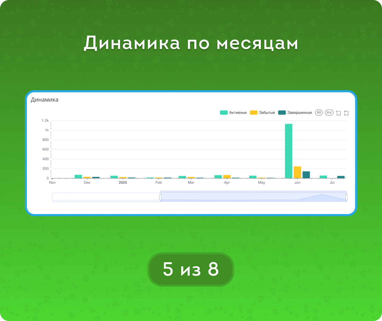 • метрикам Статусов и метрикам Активности (Активные/Забытые/Завершенные).