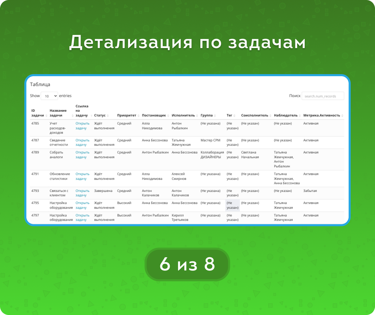Для более глубокого анализа в отчете представлена таблица с полным списком задач. Она позволяет сортировать данные по полям задач, быстро находить нужные строки с помощью поиска, а также переходить по активным ссылкам в сами задачи.