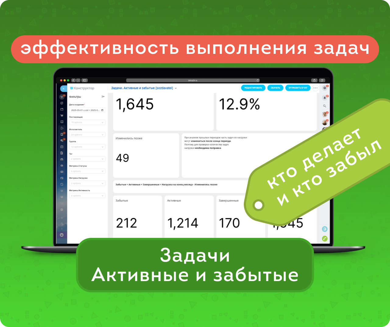 BI-отчет Задачи. Активные и забытые – полезный инструмент для анализа вовлеченности команды. Позволяет выделить задачи, с которыми действительно работают и те, что «зависли» без движения.