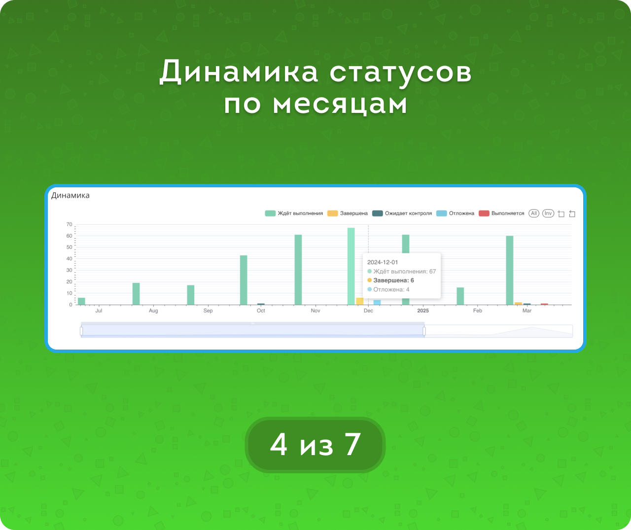 График динамики наглядно отражает, как со временем меняется ситуация со статусами: копятся ли задачи «на контроле», увеличивается ли число завершённых, или всё чаще задачи откладываются и остаются забытыми.