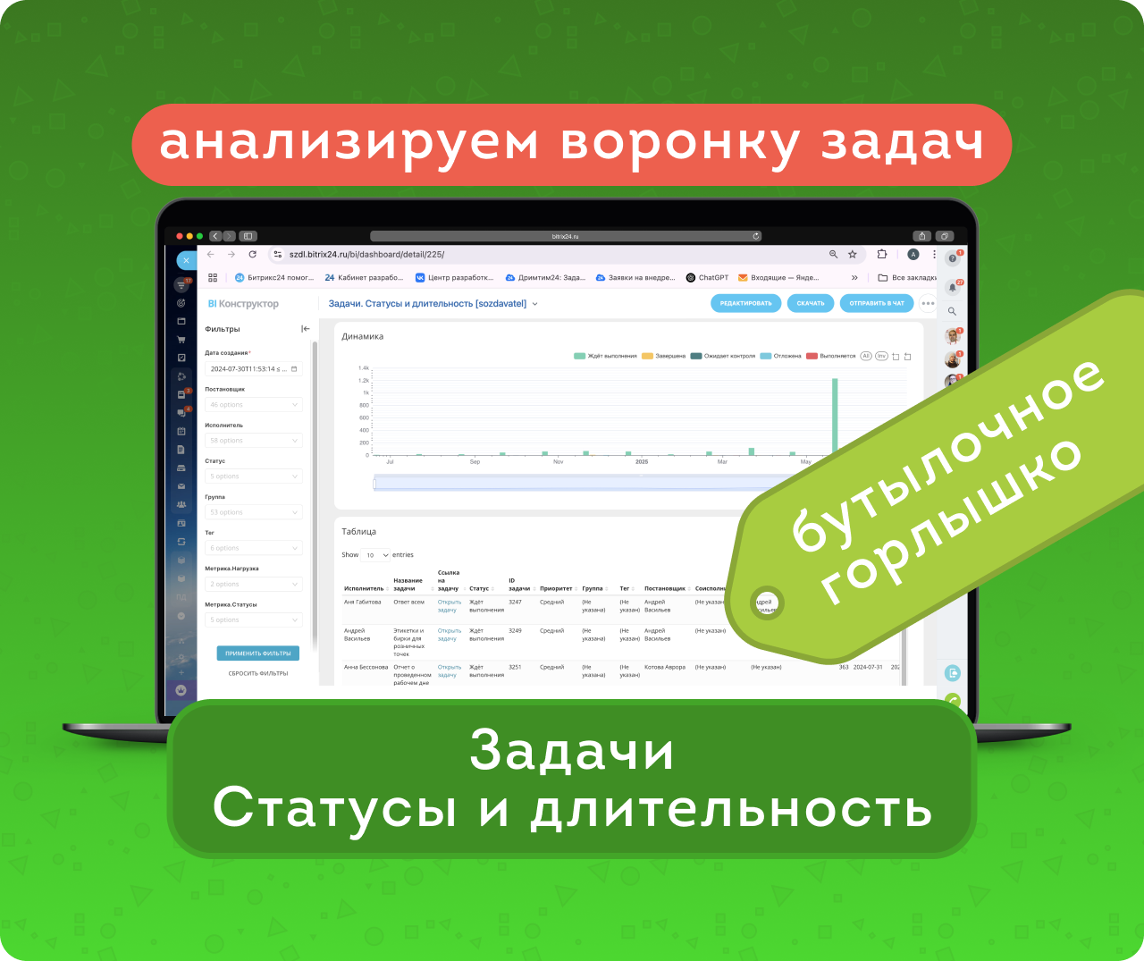Задачи. Статусы и длительность — не просто отчет, а инструмент роста. Он демонстрирует, где теряется время, на каких этапах задачи застревают и как это влияет на общую эффективность. С такими данными вы можете выстраивать процессы предсказуемо и системно. В телеграм-канале будут анонсированы следующие отчеты из комплекса «Отчёт PRO Задачи» — чтобы видеть не просто количество задач, а понимать, что стоит за этими цифрами.