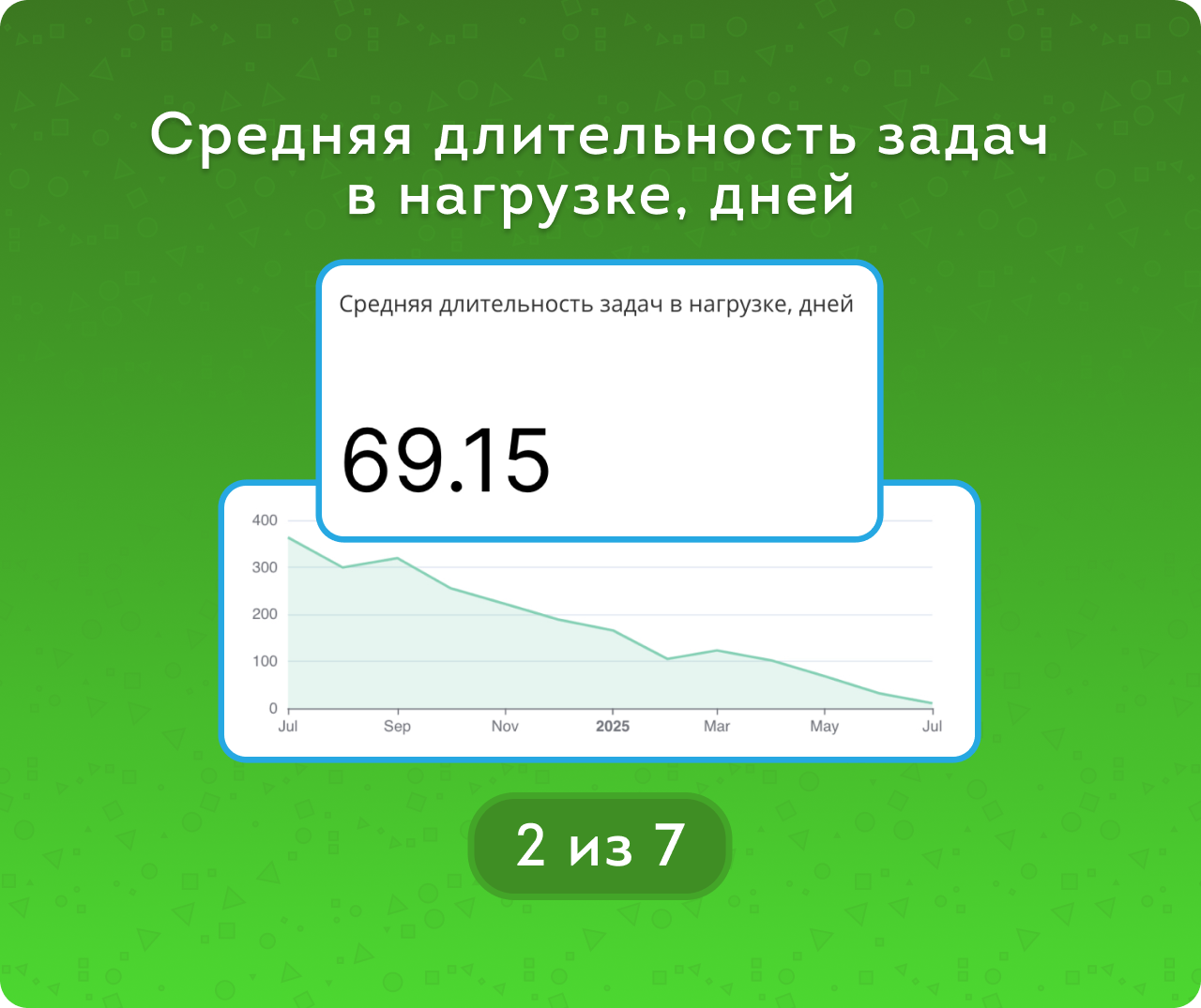 Для начала рассчитывается средняя длительность всех задач в днях. Для закрытых задач берётся интервал от даты создания до даты завершения. Для текущих (ещё не закрытых) задач — от даты создания до текущего дня.