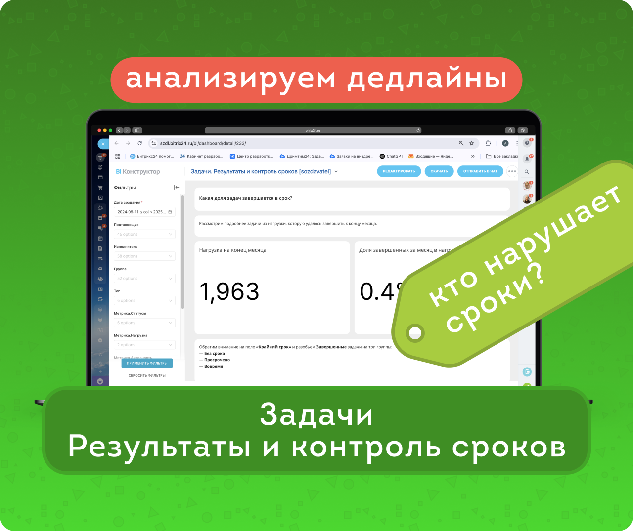 BI-отчет Задачи. Результаты и контроль сроков – полезный инструмент для анализа итогов работы и соблюдения сроков. Помогает выявить слабые места в организации процессов и принять обоснованные управленческие решения.