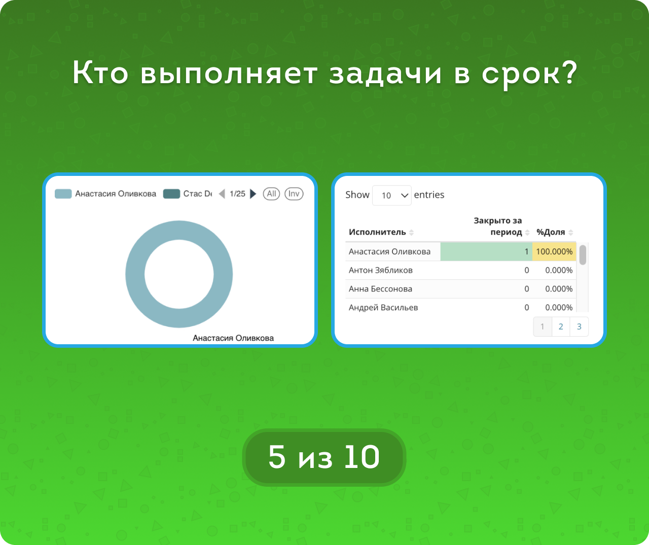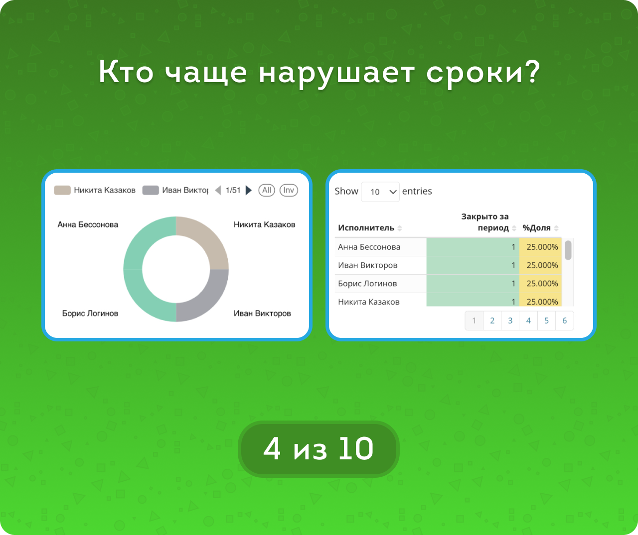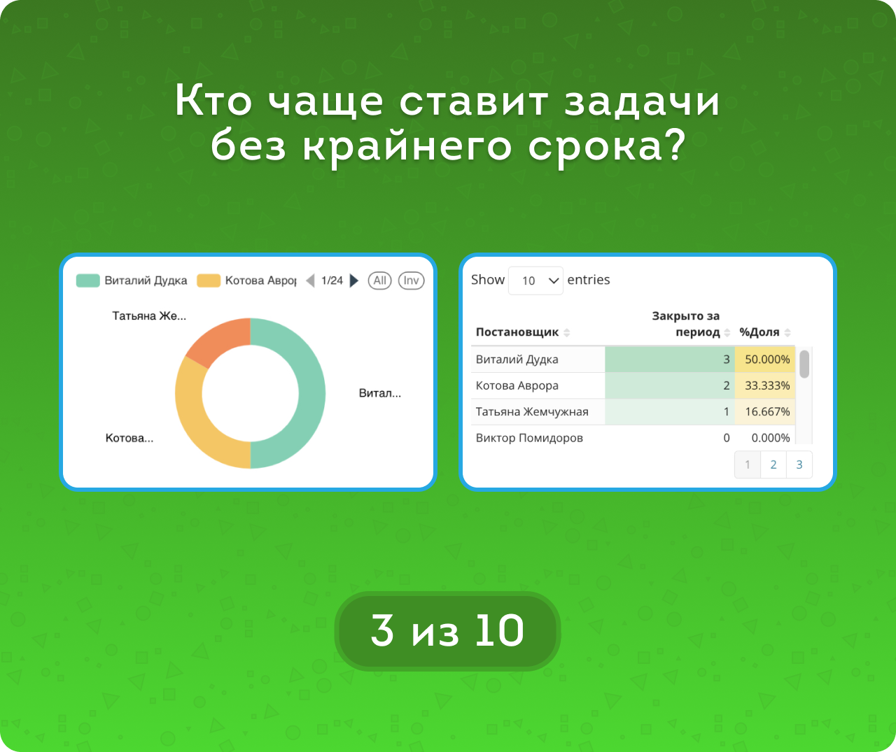 С помощью круговых диаграмм легко определить, какие сотрудники чаще создают задачи без крайних сроков, кто склонен к нарушению дедлайнов, а кто стабильно выполняет задачи в срок.