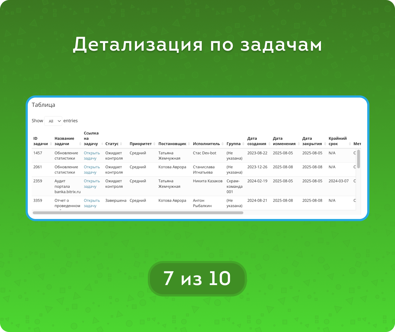 Для более глубокого анализа в отчете представлена таблица с полным списком задач. Она позволяет сортировать данные по полям задач, быстро находить нужные строки с помощью поиска, а также переходить по активным ссылкам в сами задачи.