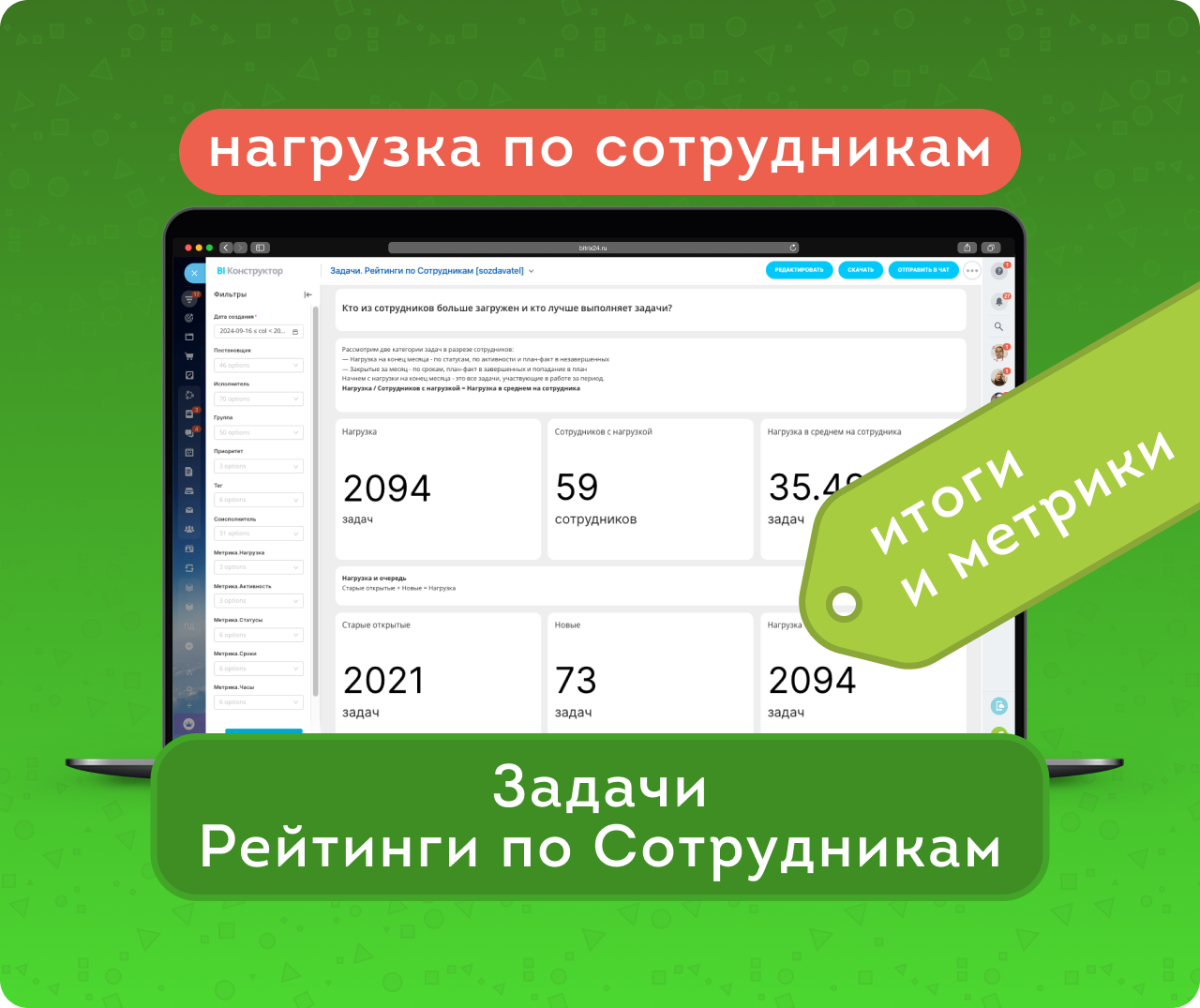 Нагрузка  — сумма старых открытых задач и новых, созданных за текущий месяц. Сотрудники с нагрузкой — те исполнители, у которых были задачи в работе за это время. А Нагрузка в среднем, на сотрудника — количество задач на одного ответственного.