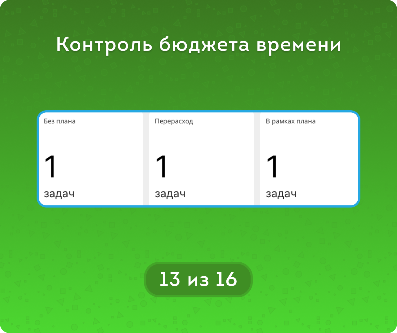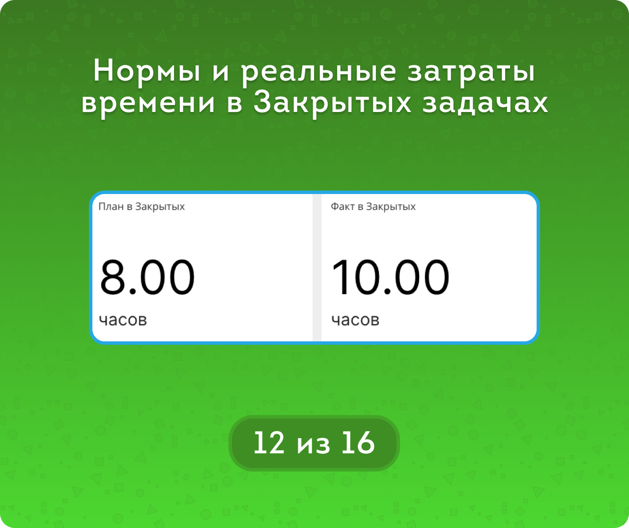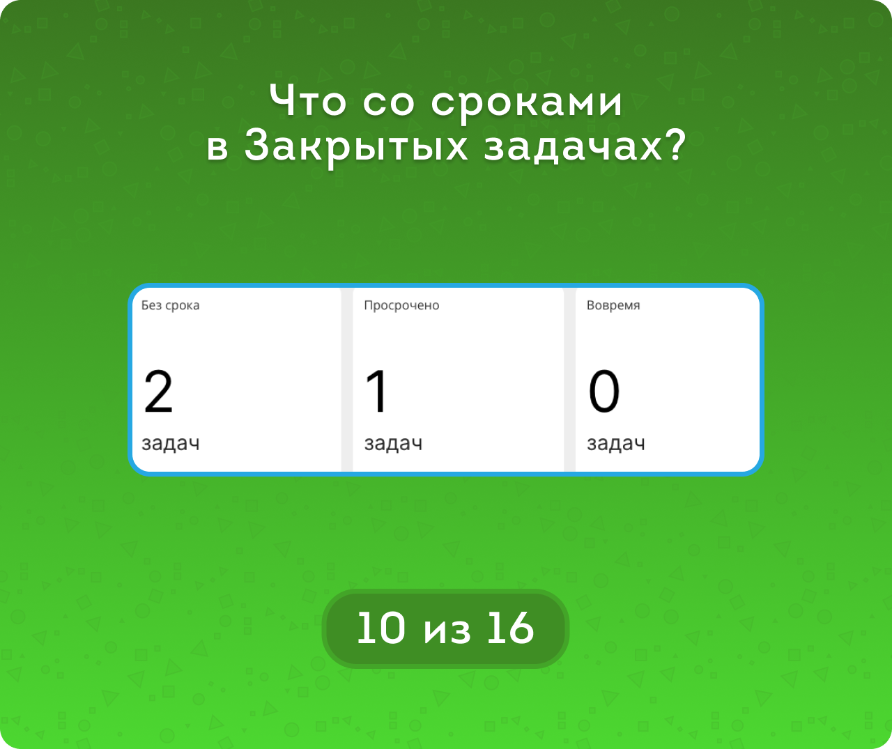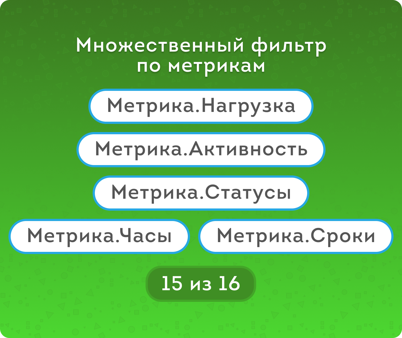 • метрикам Сроков (Без срока / Вовремя / Просрочено) и метрикам Часов (В рамках плана / Не завершено  / Перерасход) для закрытых задача, а для открытых – Пока вовремя / Пока в рамках плана и тд.