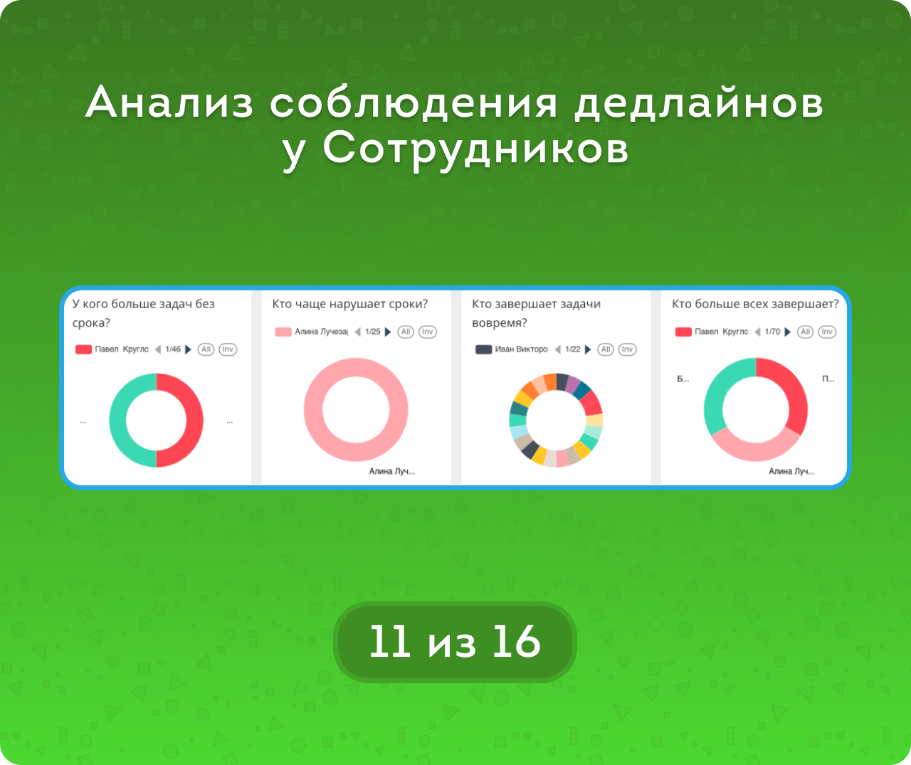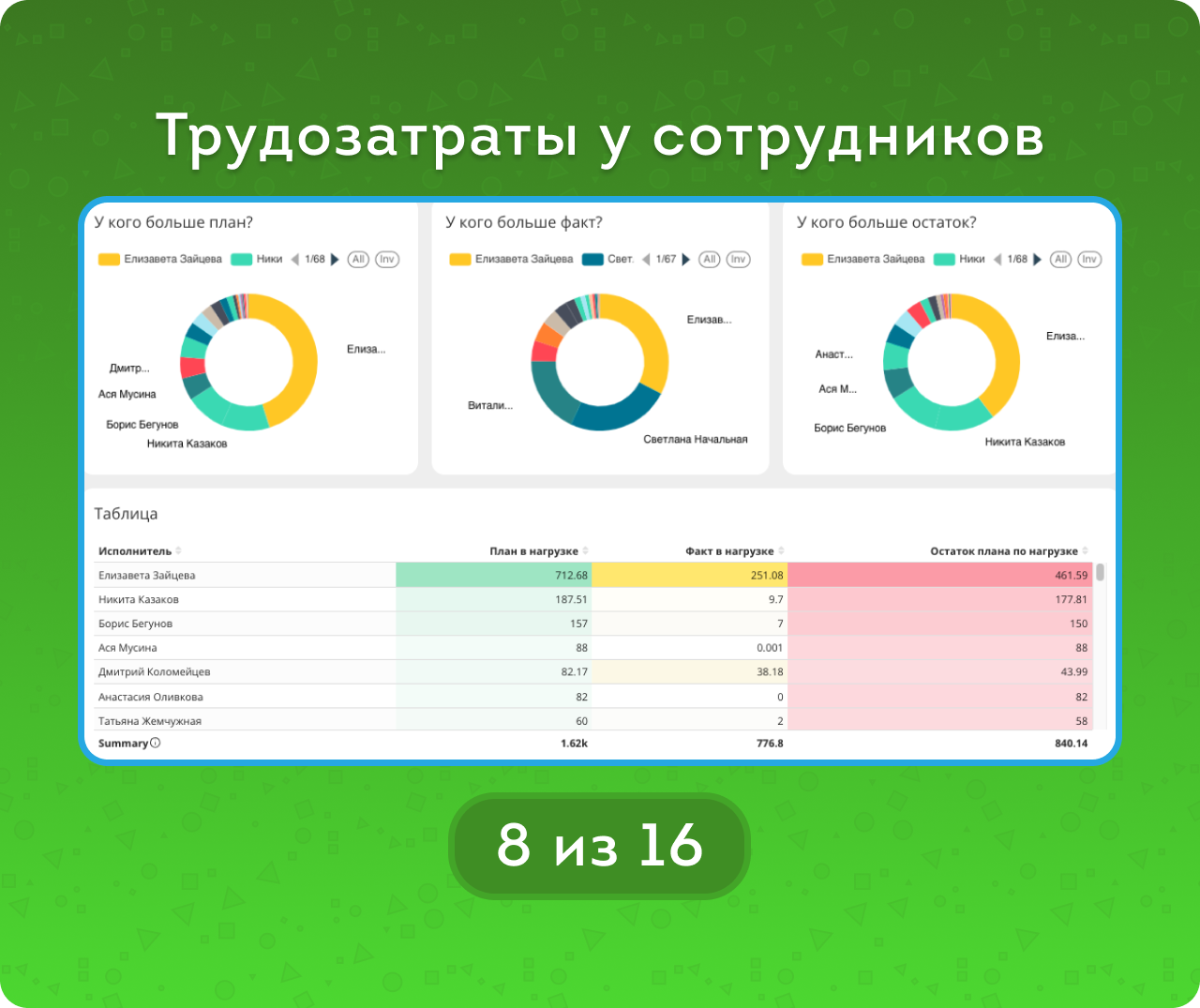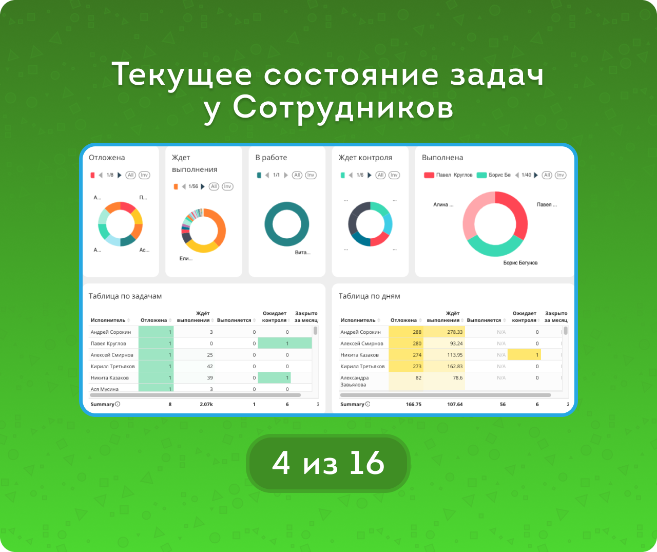 Диаграммы и таблицы показывают, кто чаще забывает о задачах, кто активно работает и кто закрывает больше всего задач.
