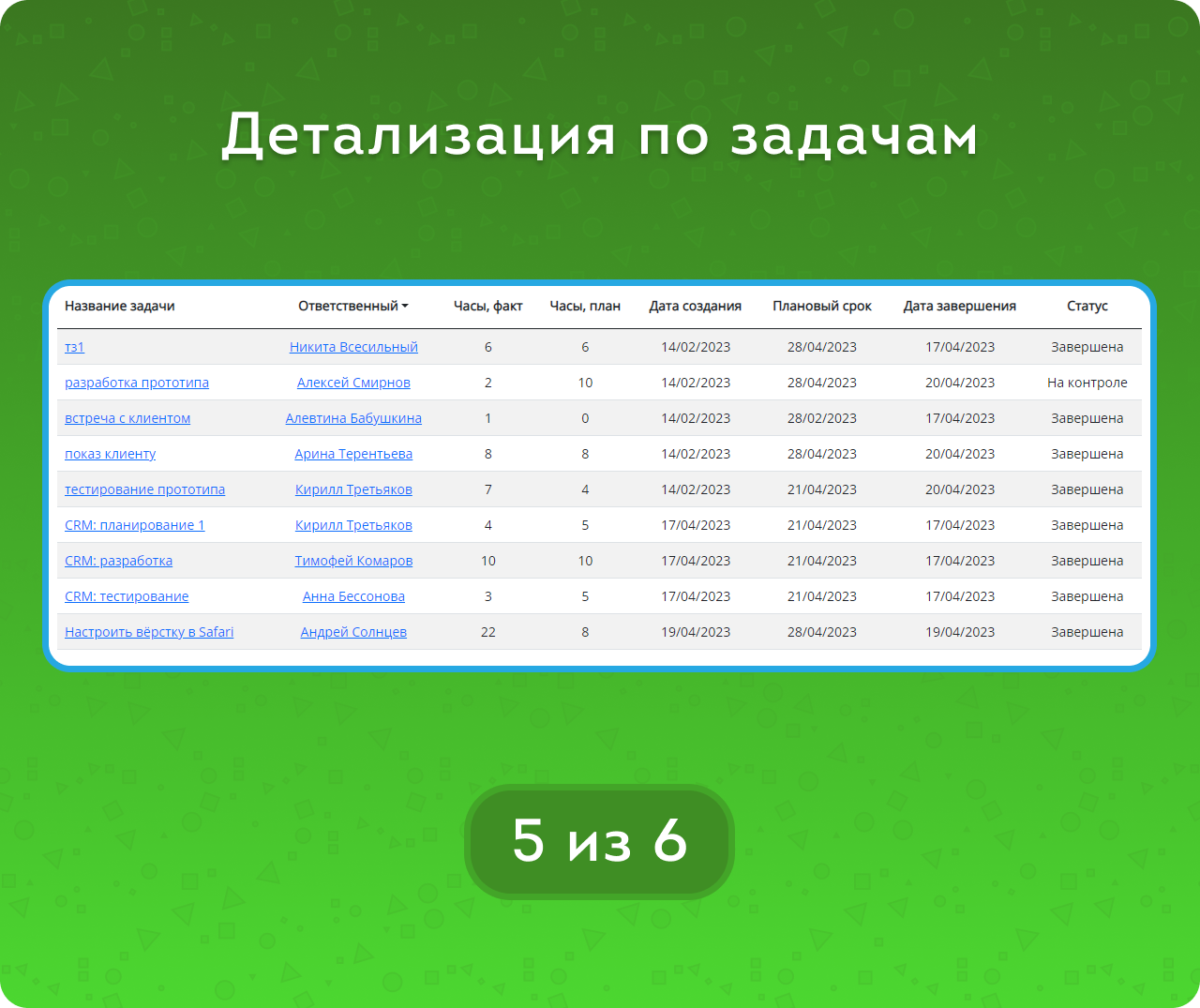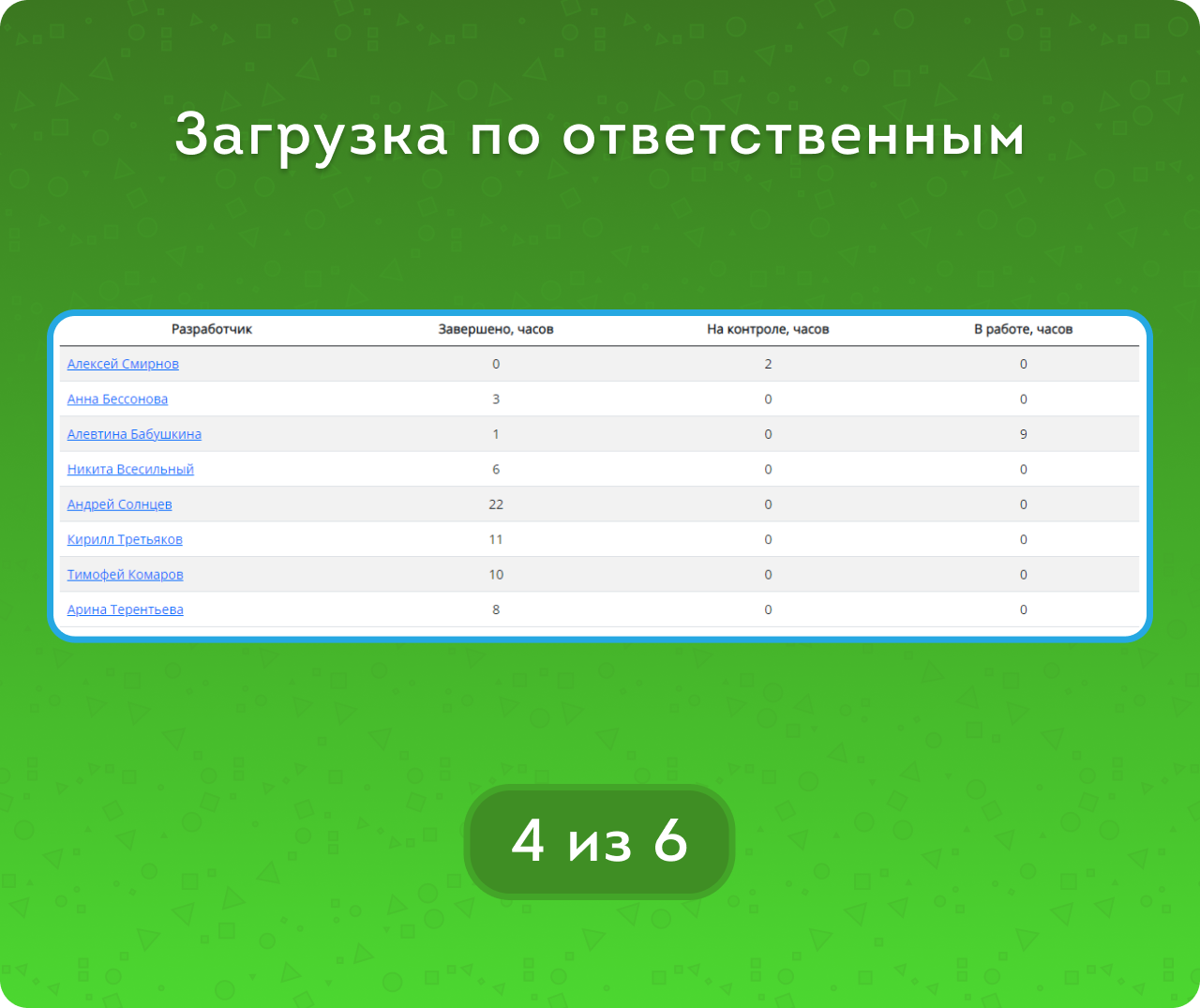 Оценить загрузку ответственных: если в Проекте большая часть задач на одном сотруднике, и он не успевает – нужно принять меры.