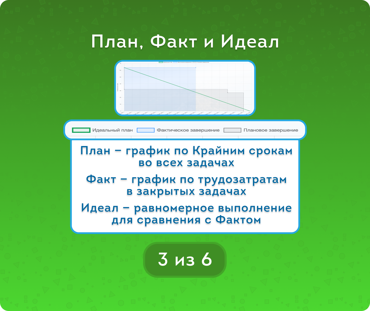 1. Идеальный план — запланированный объем работ, равномерно распределенный на весь срок выполнения проекта. Служит ориентиром для графиков «Плановое завершение» и «Фактическое завершение».