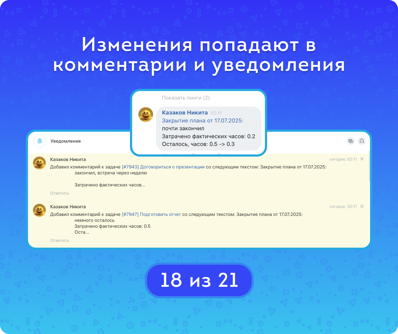 После заполнения полей необходимо нажать кнопку «Отправить отчет» – постановщику задач придет уведомление, а все изменения отразятся в карточке самой задачи (кроме прогнозируемых часов). Руководитель может просмотреть последний план сотрудника (закрытый или незакрытый), кликнув на его ФИО.