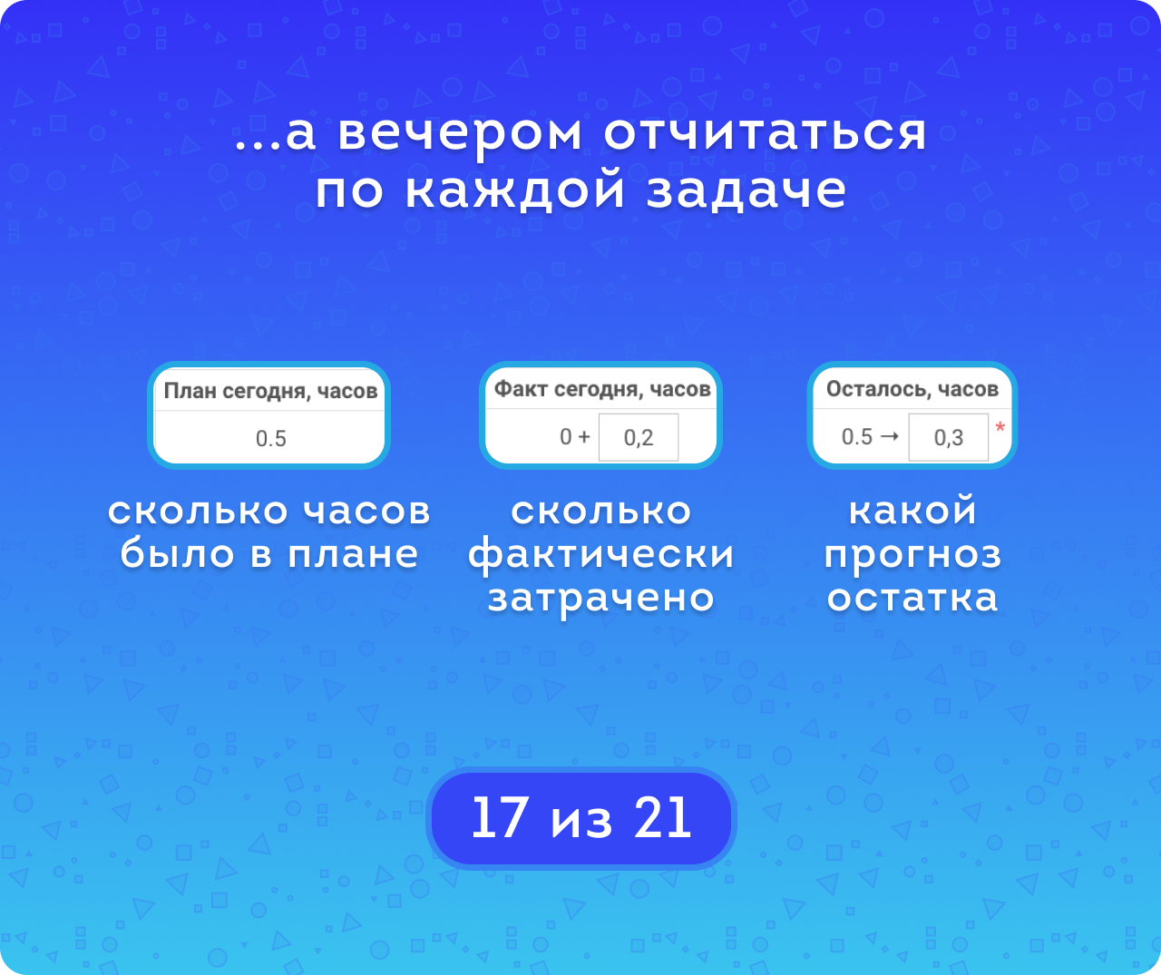 Факт сегодня, часов – время, в течении которого сотрудник сегодня работал над задачей. Если в самой задаче время затречено — оно отобразится и в приложении (тогда его не нужно заполнять).