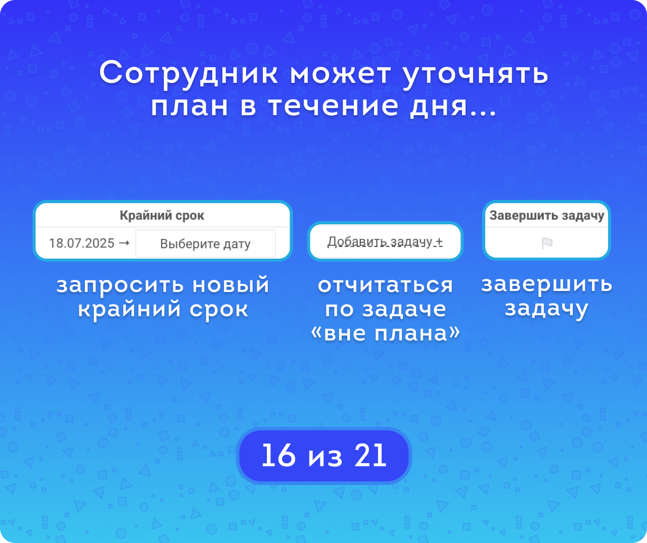 Сотрудник видит только свой план на день. В нем он может добавить задачу «вне плана», перенести крайний срок или завершить задачу.
