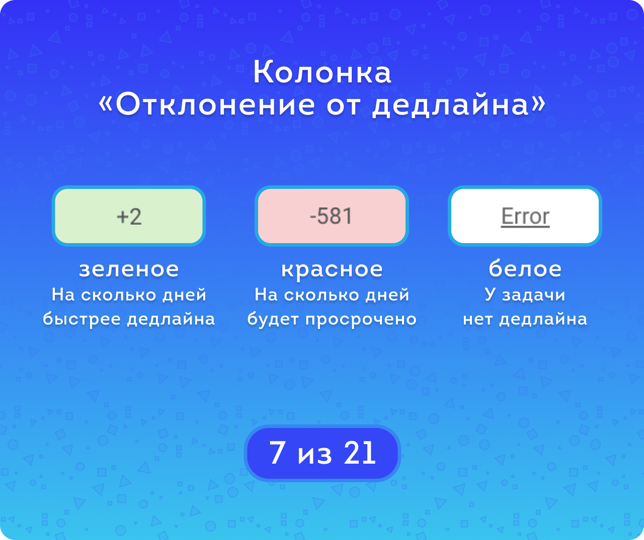 Красные с минусом — сколько дней пройдет с момента дедлайна на дату её завершения;