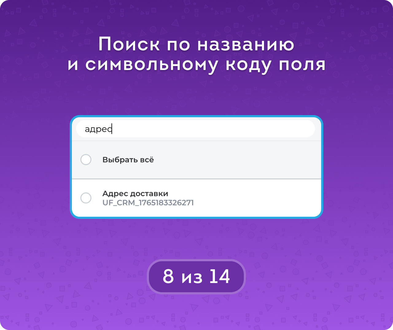 Вся информация о полях отображается в удобном формате: название и символьный код. Чтобы быстро находить нужное, можно воспользоваться поиском — достаточно ввести часть названия или кода. Приложение показывает даже скрытые поля, доступные только через Rest API.