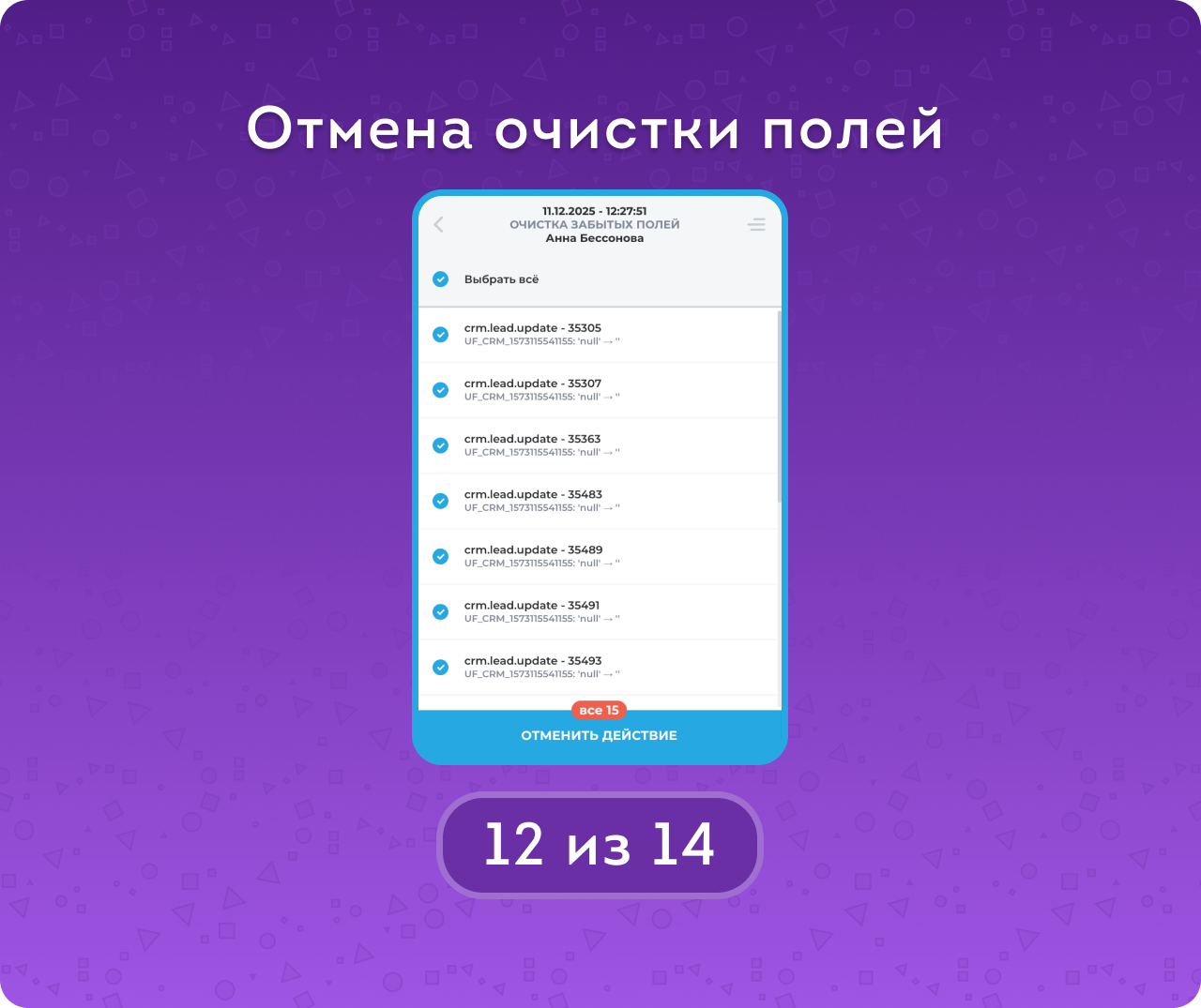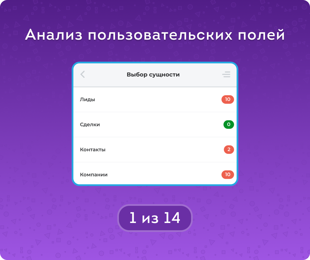 Приложение анализирует каждое пользовательское поле вне зависимости от стадии сущностей или её даты создания, поэтому вы получаете полную картину — без «слепых зон» и пропущенных данных.