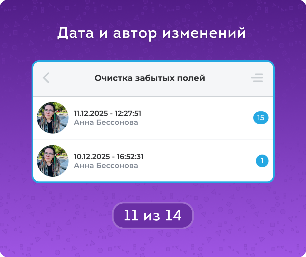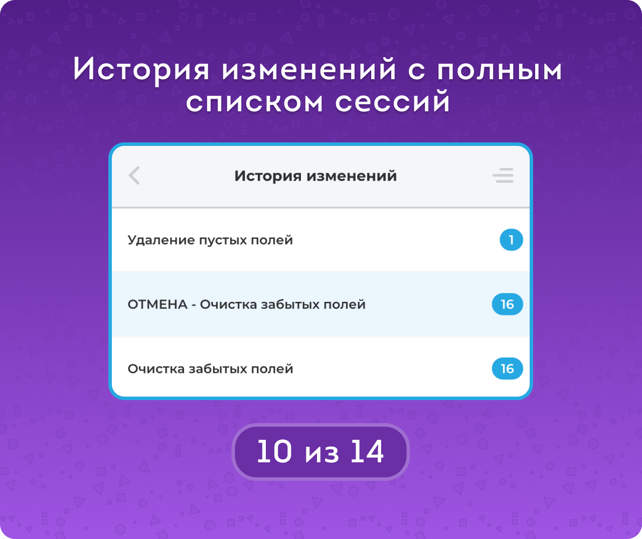 Все действия фиксируются в Истории изменений: вы видите каждую сессию, дату и автора. При необходимости можно отменить очистку.